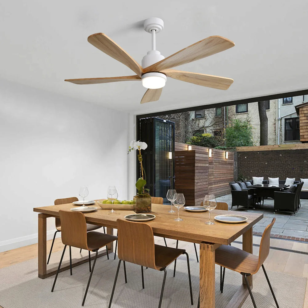 Enhance your living space with this stylish 52-inch indoor ceiling fan featuring five solid wood blades that deliver efficient, whisper-quiet airflow. Designed with a reversible DC motor, this fan cools your room in the summer and gently circulates warm air in the winter, making it a versatile addition all year long. The integrated dimmable LED light offers three color temperatures (3000K, 4000K, 6000K), allowing you to customize ambiance and brightness for any setting. Controlled easily via remote or smart app, this fan brings modern convenience and energy efficiency to medium to large rooms up to 320 square feet. Its minimalist white body with natural wood blades blends effortlessly with farmhouse, rustic, or contemporary interiors. Elevate your comfort and style today with this smart, multifunctional ceiling fan.