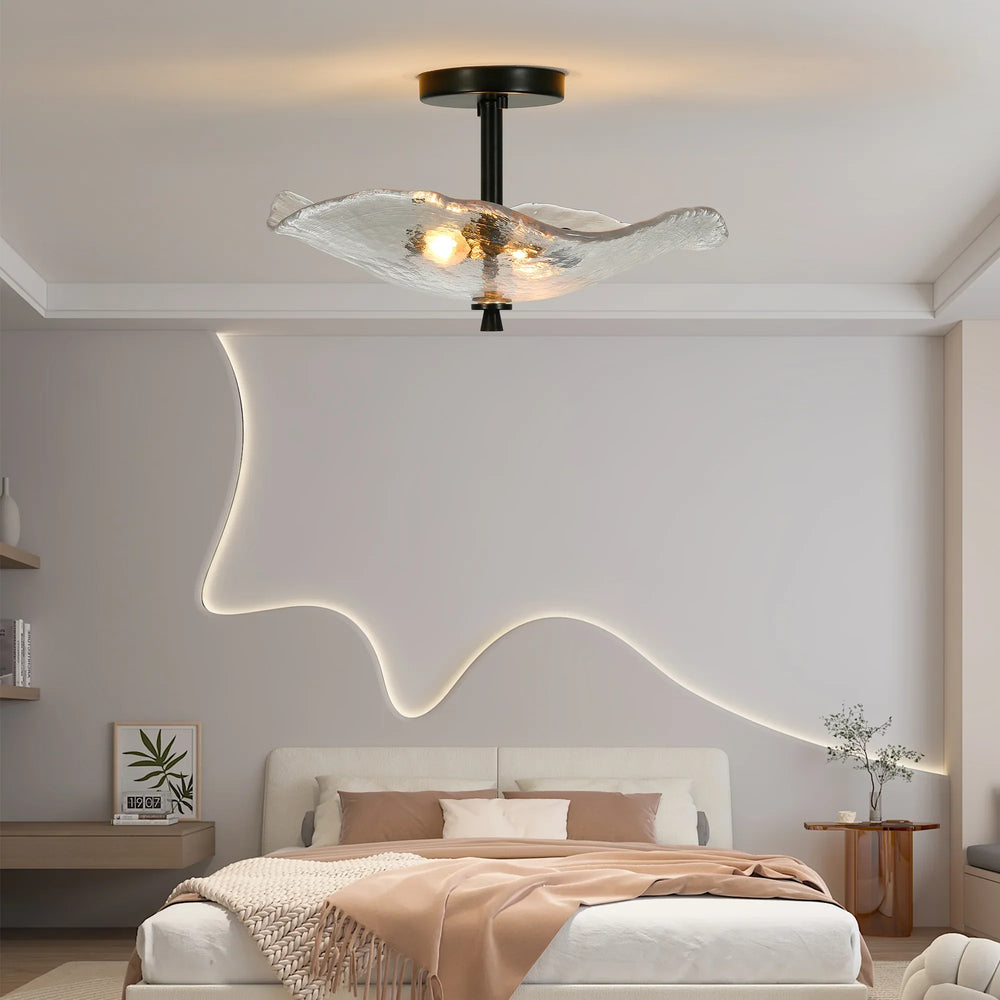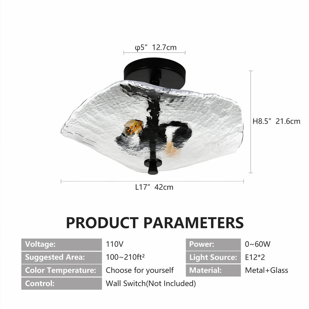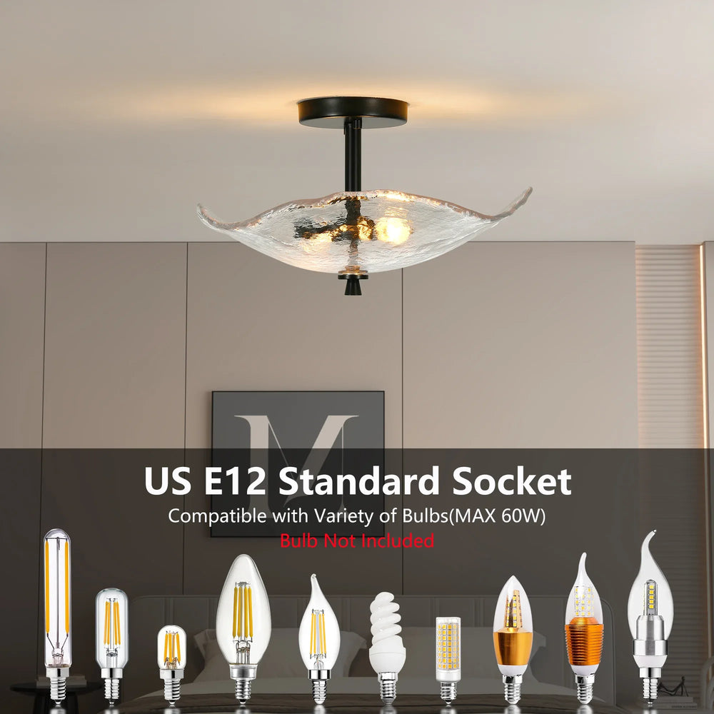 Elevate any indoor space with this sleek flush mount ceiling light featuring a stunning water ripple glass shade. Designed with durable black iron and thick glass, it merges modern style with elegant floral elements inspired by lotus leaves. Its compact size of 16.5 inches long, 13.6 inches wide, and 8.5 inches high makes it perfect for hallways, bedrooms, kitchens, and living rooms, providing bright, inviting illumination. This semi-flush mount fixture easily accommodates E12 base bulbs (not included), allowing you to customize your lighting with warm or cool tones. Its lacquered finish ensures lasting durability, while the open frame design simplifies bulb replacement. Upgrade your home lighting and create a cozy, stylish atmosphere today.