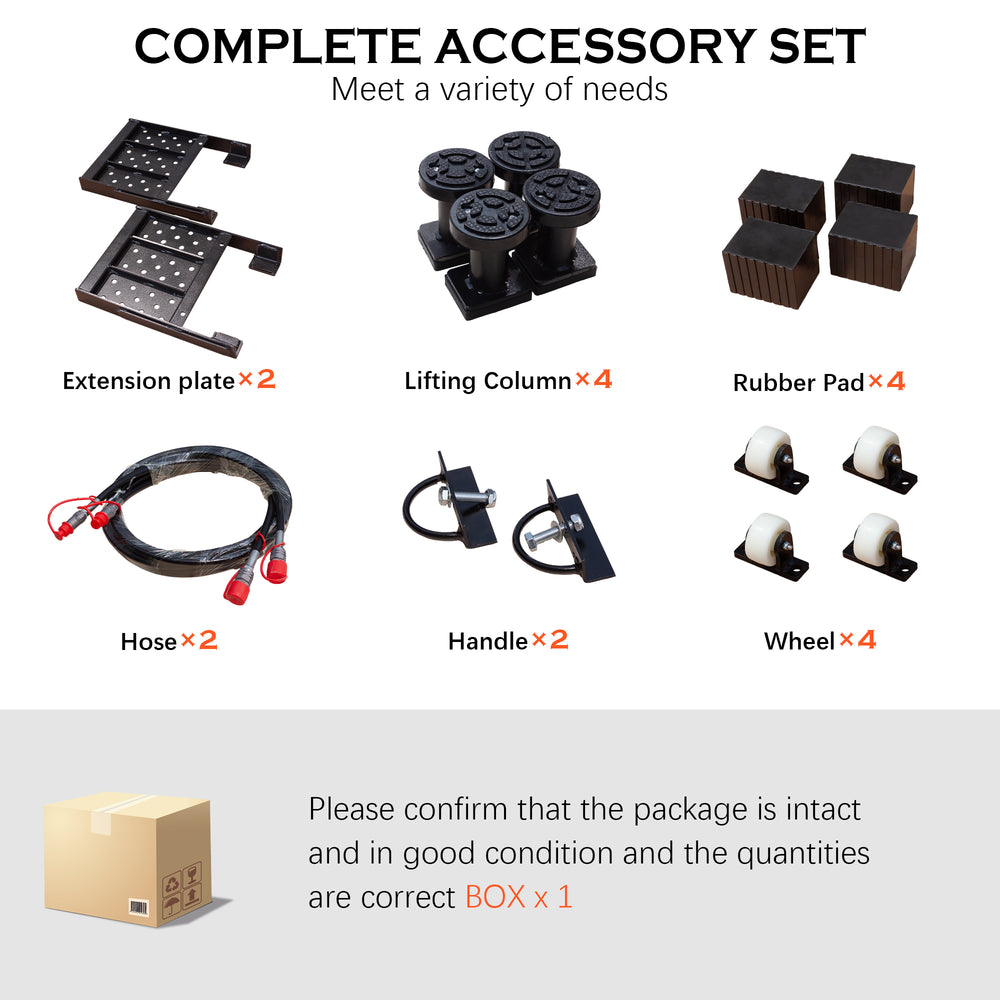 - Complete Kit Included: Comes with rubber pads, lifting columns, hoses, extension plates, handles, casters, bolts, washers, and manual.