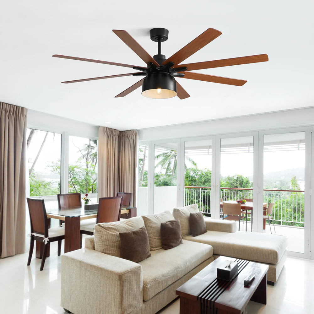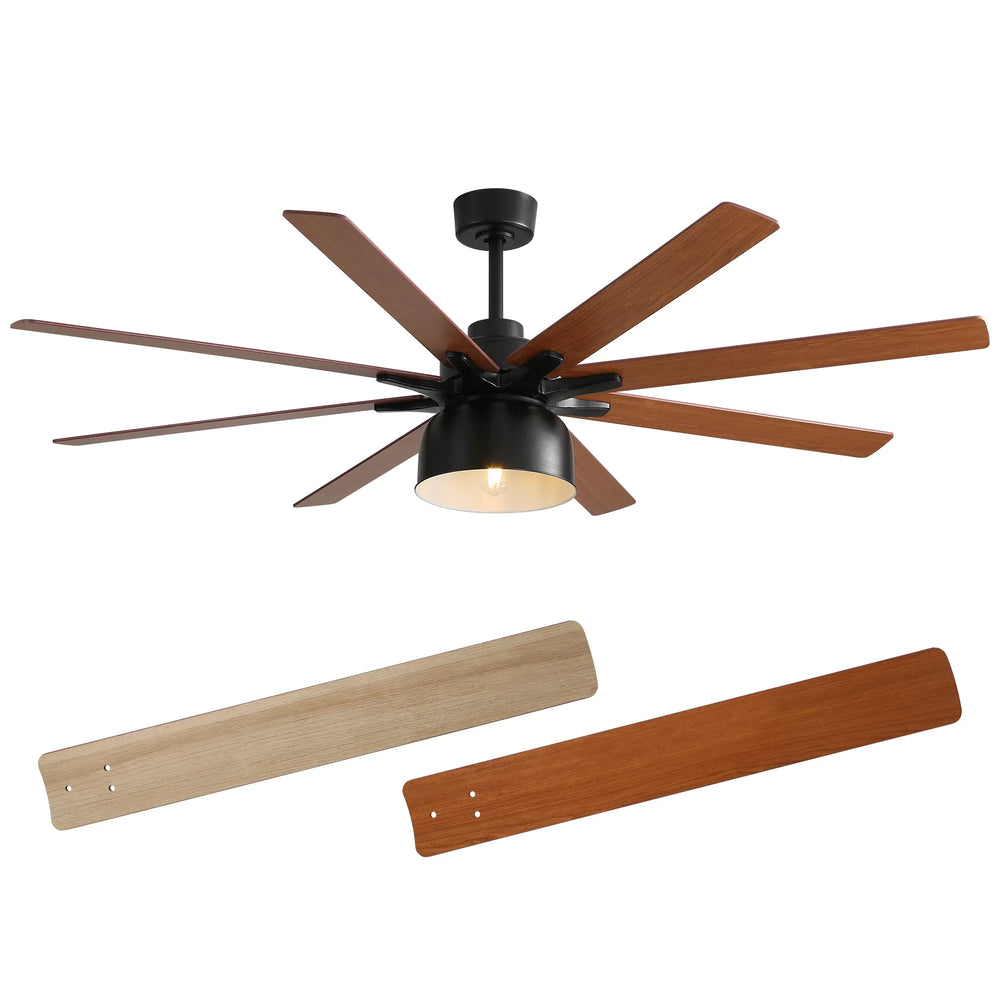 52 inch ceiling fan with dual-color plywood blades features a reversible DC motor for quiet, energy-efficient operation and year-round comfort. Includes multi-speed remote control with timer, natural wind, and separate light switch, ideal for farmhouse or living room settings.