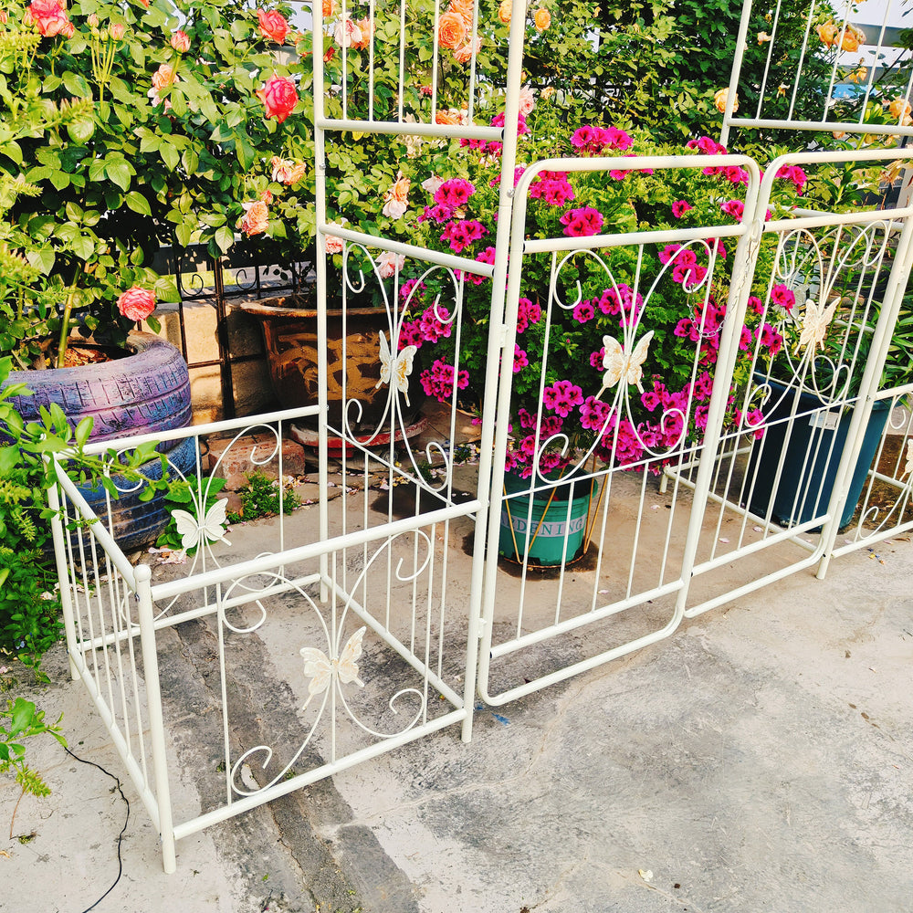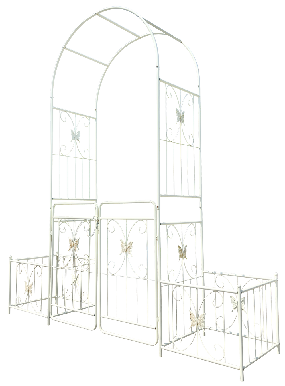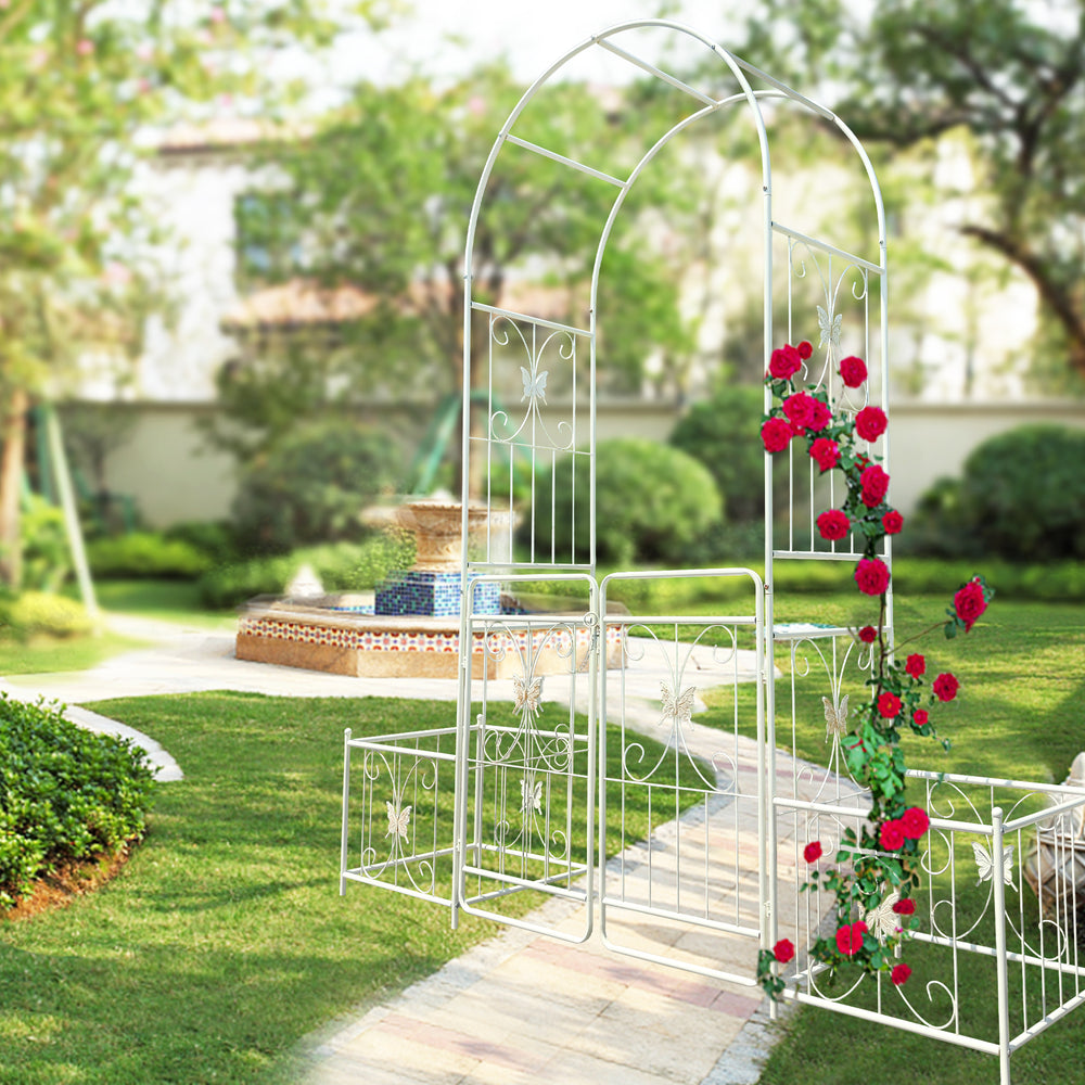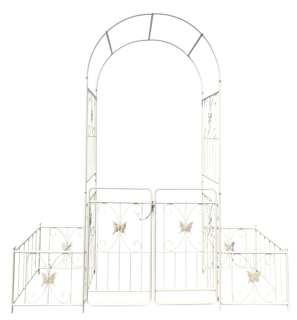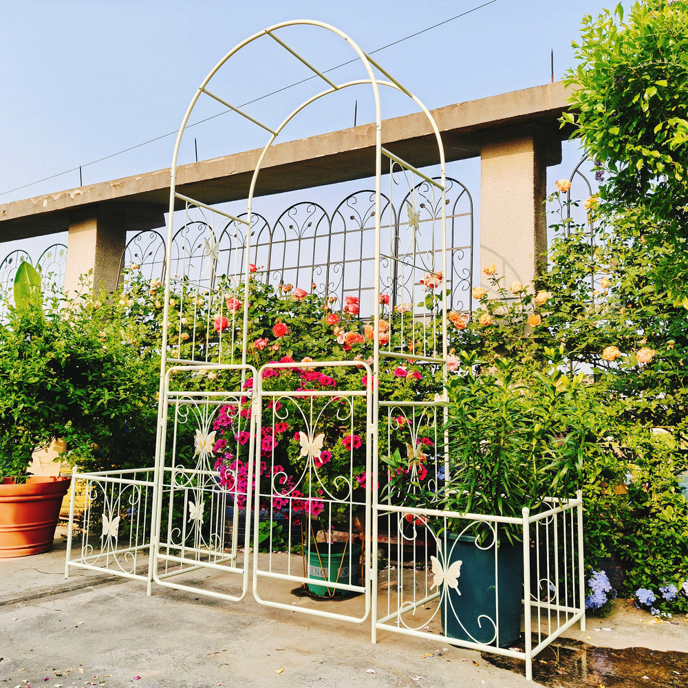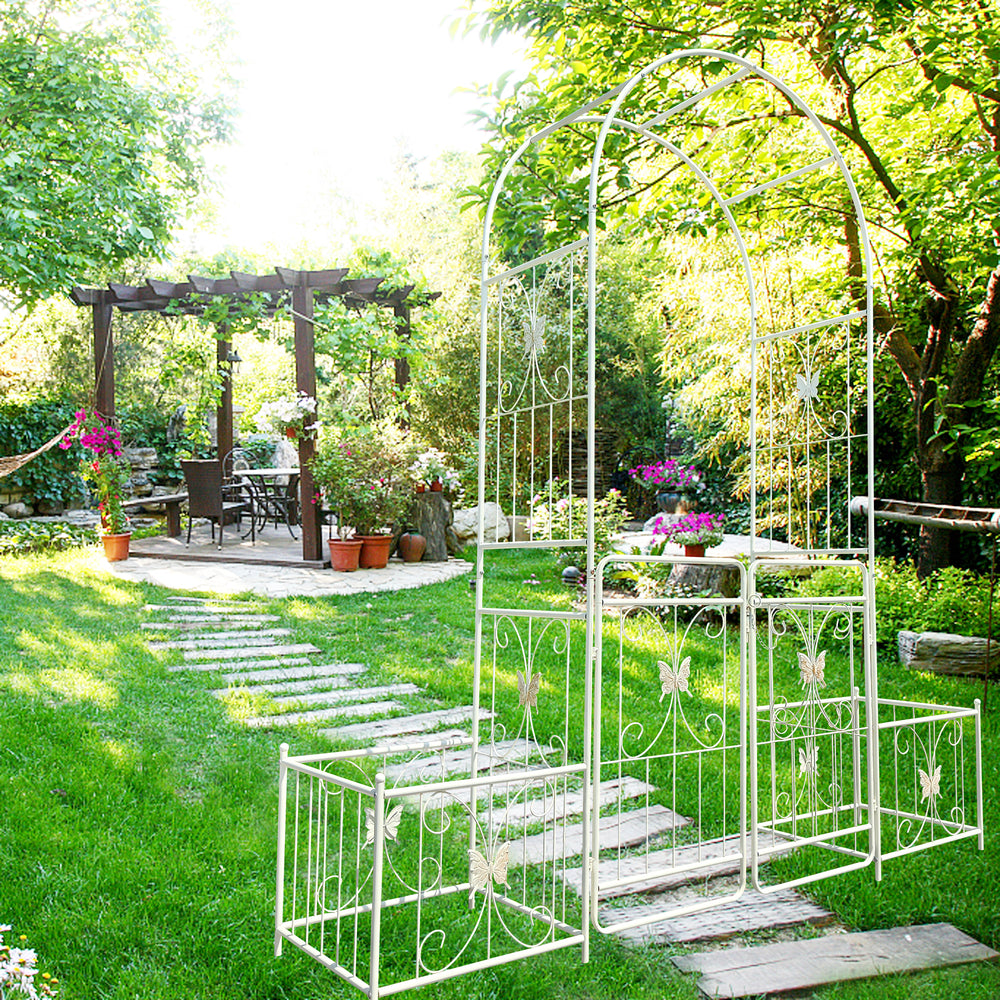 Create a charming focal point in your outdoor space with this creamy white metal garden arch, designed to support climbing plants like roses, ivy, and clematis. Standing 86.6 inches high and 79.5 inches wide, its French-style double gate design not only adds privacy but also invites your garden to bloom in style. Crafted from durable iron with a galvanized tube structure and powder-coated finish, this arch offers superior rust resistance and stability. Two side planter stands provide added convenience, letting you grow flowers or place pots right beside the arch for an inviting, lush look. Easy to assemble with pre-drilled holes and clear instructions, this arch is perfect for any garden or outdoor setting. Elevate your outdoor oasis today with this versatile and decorative garden arch.