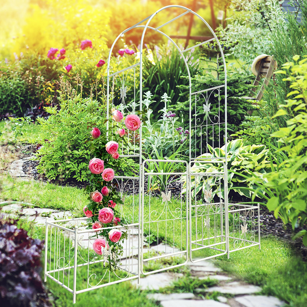 Creamy white metal garden arch features durable galvanized iron with powder coating for rust resistance and stability. Its double gate design with side planter stands supports climbing plants, enhancing outdoor garden privacy and decoration while being easy to assemble.
