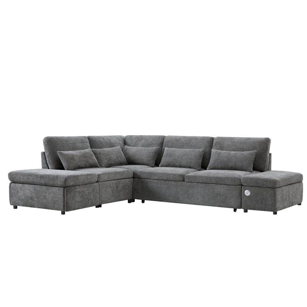 This gray chenille sectional sofa features a dual-function space-saving design that converts from a 4-seater to a double bed. It includes five adjustable lumbar pillows, built-in USB and Type-C charging ports, a movable ottoman with storage, and a sturdy plywood frame for lasting comfort and convenience.
