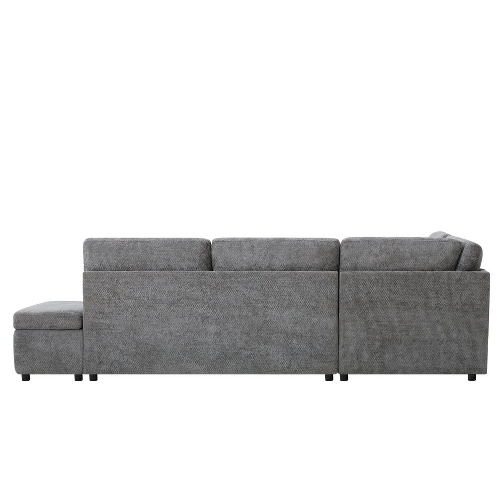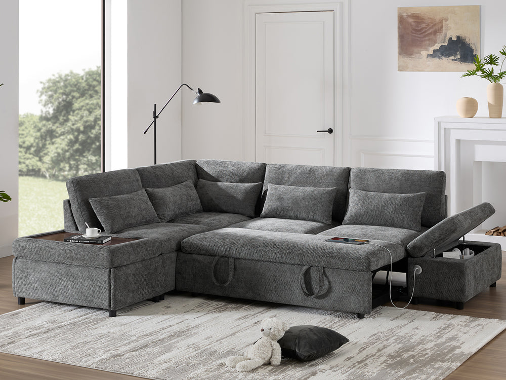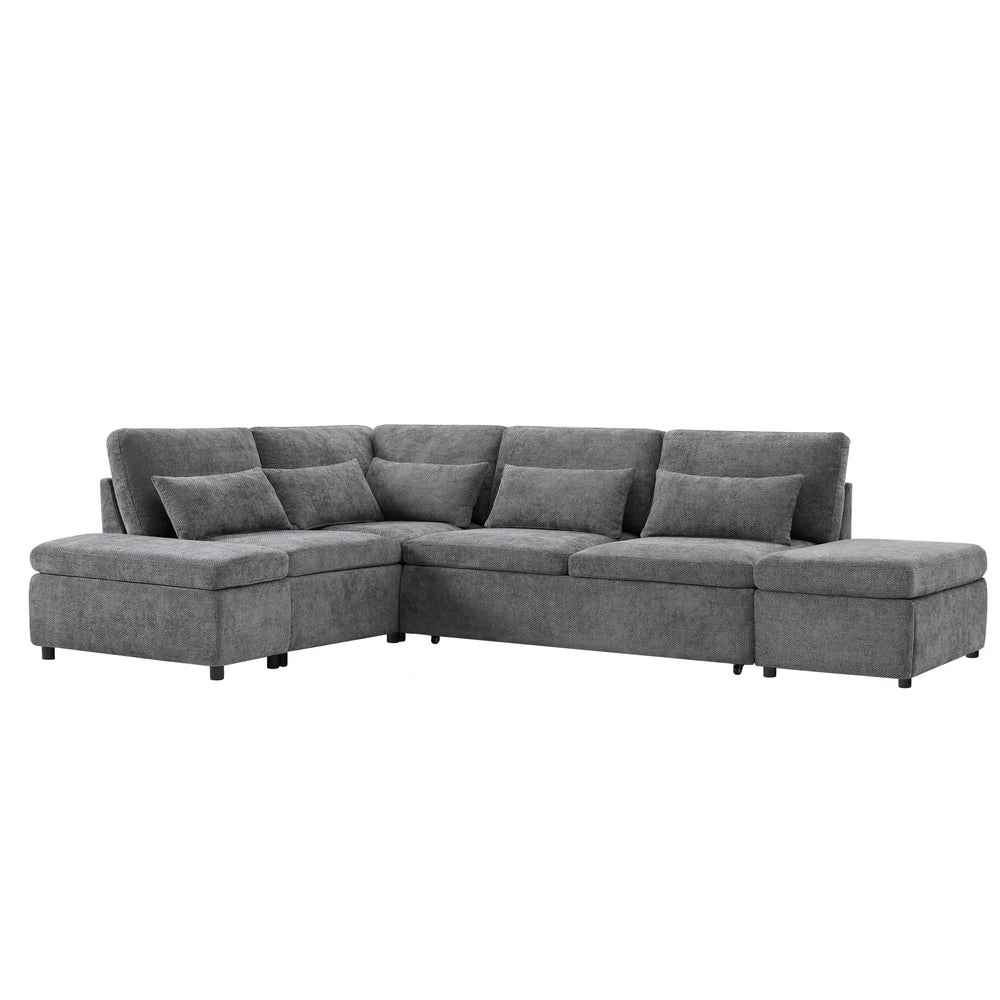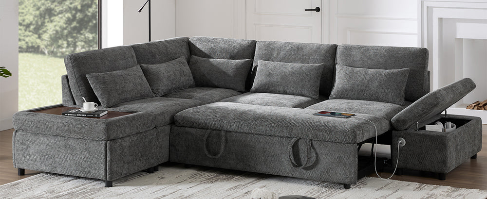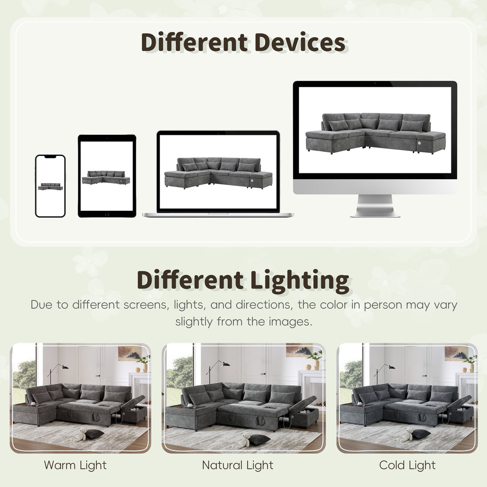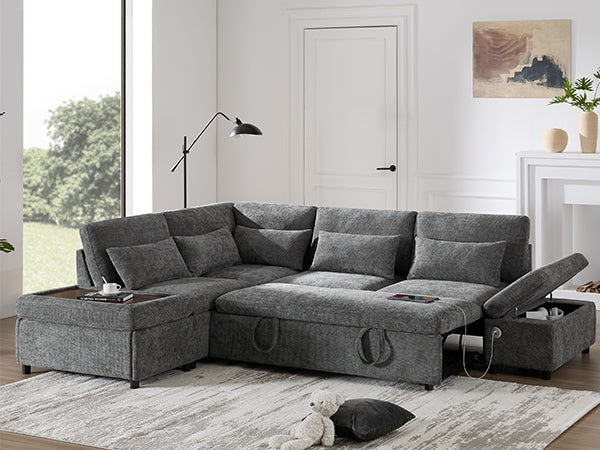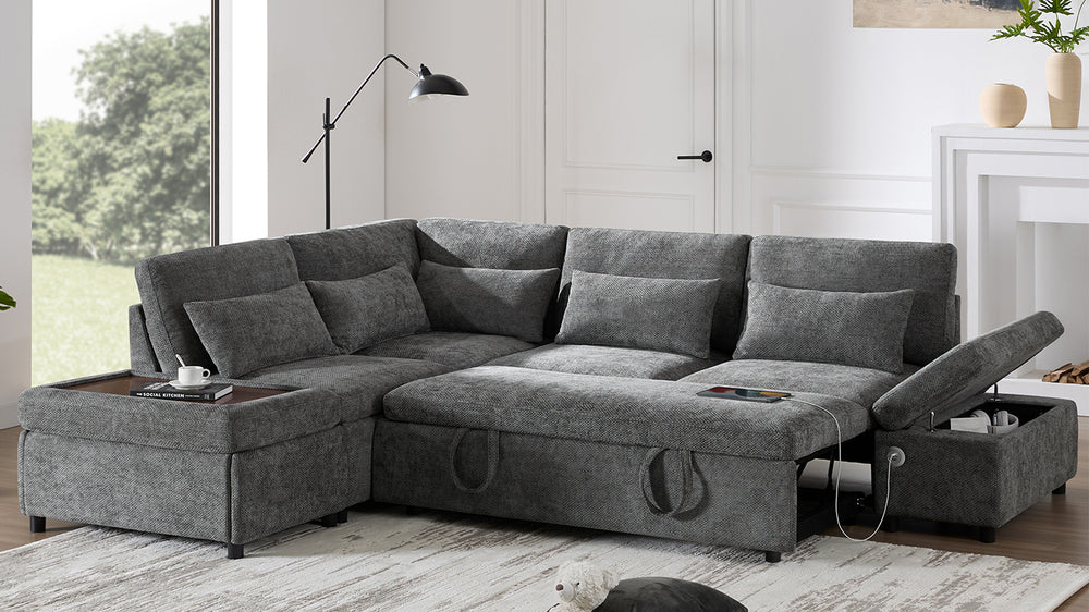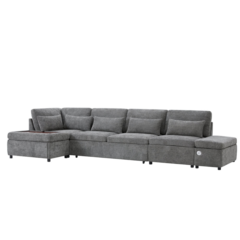 Designed to transform your living space, this gray chenille sectional sofa offers both style and versatility. Effortlessly convert the cozy 4-seater into a spacious double bed with its smooth pull-out mechanism, perfect for unexpected guests or optimizing apartment living. Crafted with a sturdy plywood frame and plush foam cushions, enjoy cloudlike comfort supported by five adjustable lumbar pillows and an ergonomic adjustable armrest. Stay connected and powered up with built-in USB and Type-C charging ports integrated into the armrest. The movable ottoman and multi-function armrest storage provide smart organization while the ottoman’s reinforced wooden lid doubles as a convenient side table. With durable chenille fabric and easy-to-clean cushions, this 6-seat sectional effortlessly blends comfort, modern convenience, and functionality. Elevate your living room experience today.