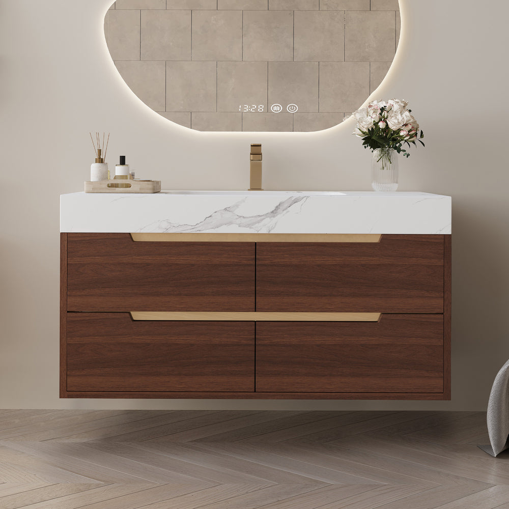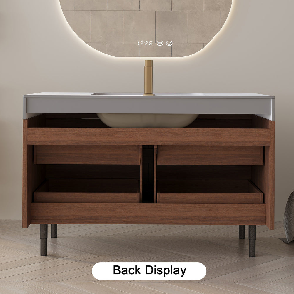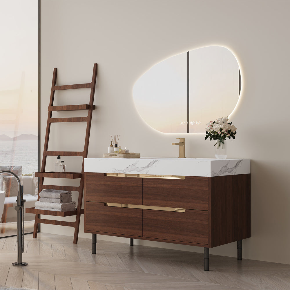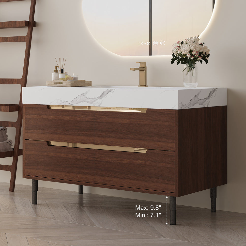 Experience a perfect blend of farmhouse charm and modern durability with this elegant bathroom vanity. Featuring a luxury sintered stone countertop, it resists scratches, stains, and heat, ensuring lasting beauty. The sleek undermount ceramic sink with a non-overflow design simplifies cleaning and elevates your bathroom’s minimalist aesthetics. Crafted from waterproof multi-layer solid wood, the cabinet withstands humidity to maintain strength and shape over time. Four soft-close drawers offer ample, quiet storage to keep essentials organized and out of sight. Supported by stylish powder-coated iron legs with hidden gold handles, this vanity is both a statement piece and highly functional. Whether free-standing or wall-mounted, it comes ready with mounting hardware and an adjustable drain pipe for flexible installation. Upgrade your bathroom with this versatile, durable vanity that combines classic style and practical features. Elevate your space today.