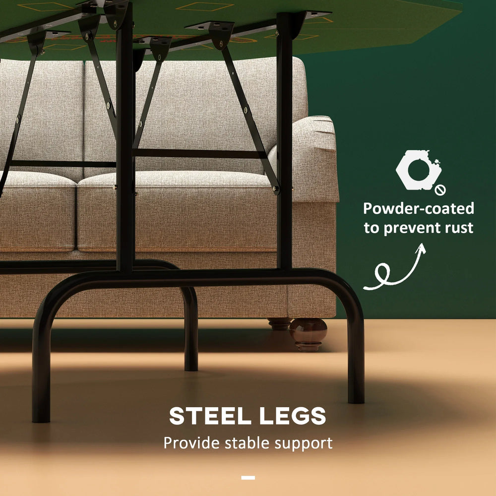 Foldable poker table with sturdy MDF and steel construction, classic felt surface, and built-in chip trays and cup holders for eight players. Portable design folds flat for easy storage and transport, ideal for game nights and social gatherings.