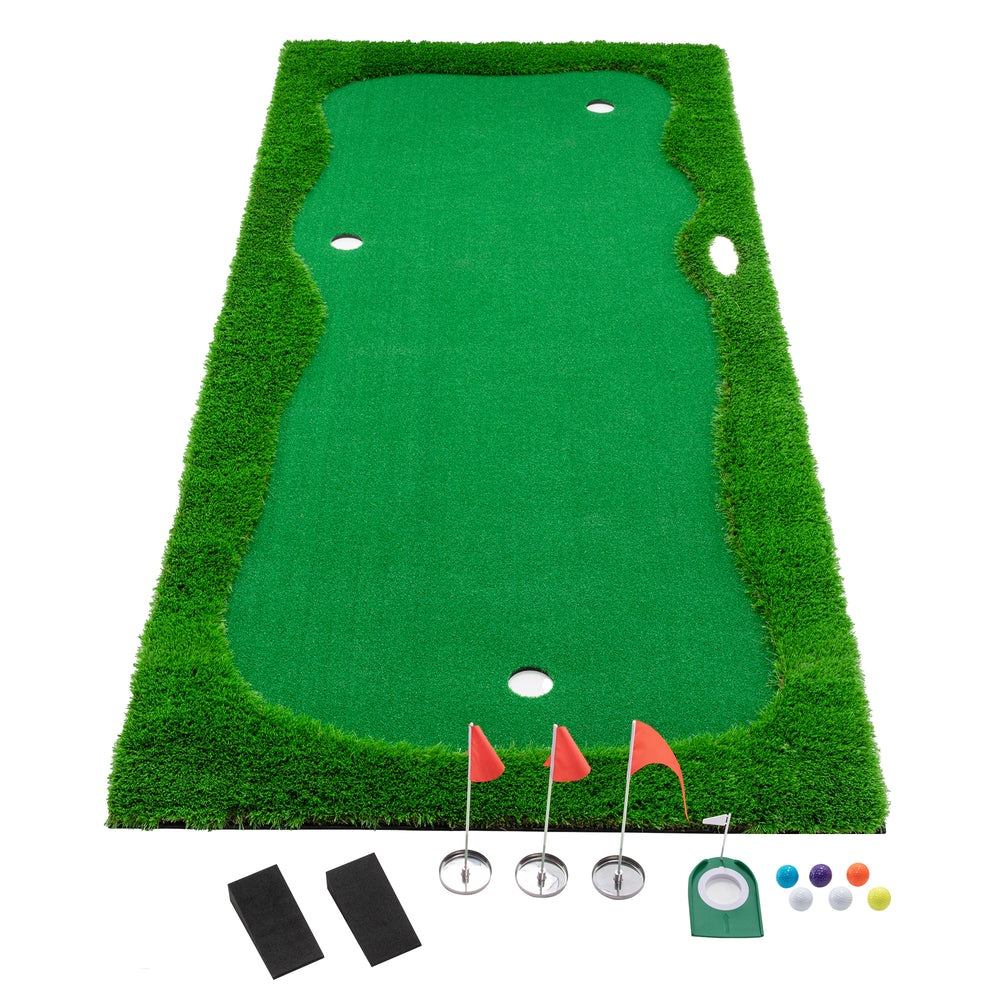 Bring the golf course home with this premium golf putting green, designed for both indoor and outdoor use. Crafted with high-quality, dense turf that mimics the feel and texture of a real course, this training mat helps improve your putting skills with 3 strategically placed holes. The 0.4-inch thick rubber non-slip base ensures stability and safety during practice, resisting slips and high temperatures. Complete with stainless steel cups and flagpoles, it offers a realistic golfing experience that sharpens accuracy and precision. Easy to roll up and transport, this mat fits seamlessly into any practice routine, whether you're a beginner or a seasoned golfer. Elevate your game and enjoy golf practice anytime, anywhere.