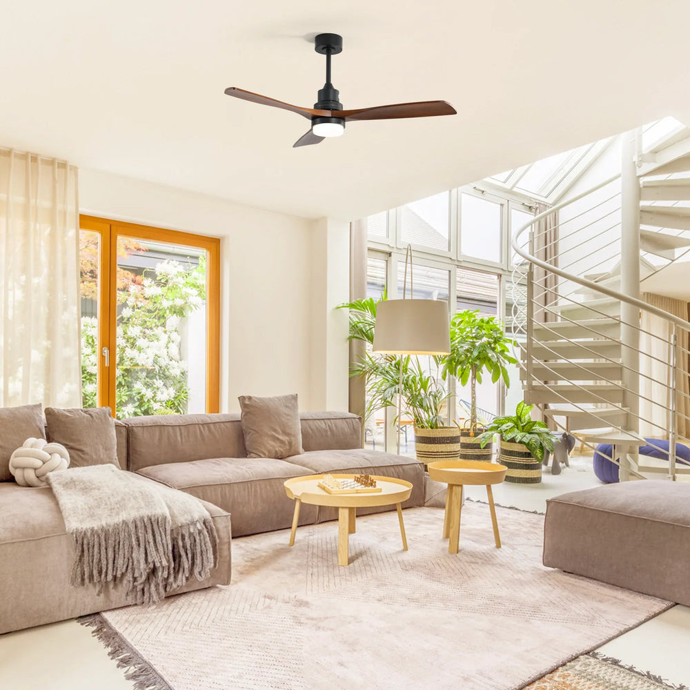 This 52-inch ceiling fan features energy-efficient ultra-quiet DC motor with reversible walnut wood blades, remote control with 6 speeds, and an adjustable 3-color LED light, providing powerful airflow and ambient lighting ideal for medium to large indoor and covered outdoor spaces.
