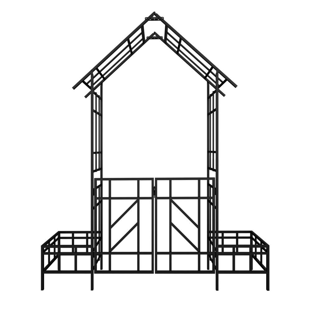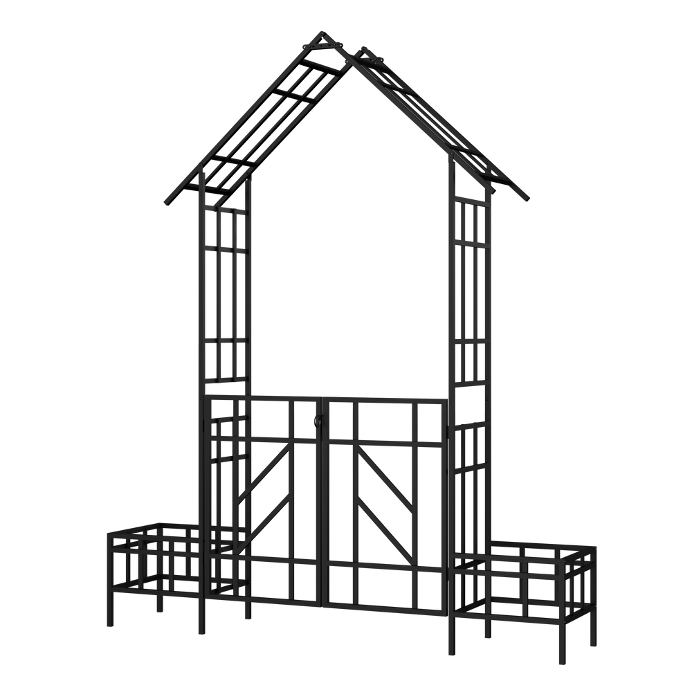 Metal garden arch with gate and planter features galvanized iron with powder coating for rust resistance and stability. Ideal for supporting climbing plants like roses and jasmine, it enhances outdoor garden privacy with easy assembly and durable design.