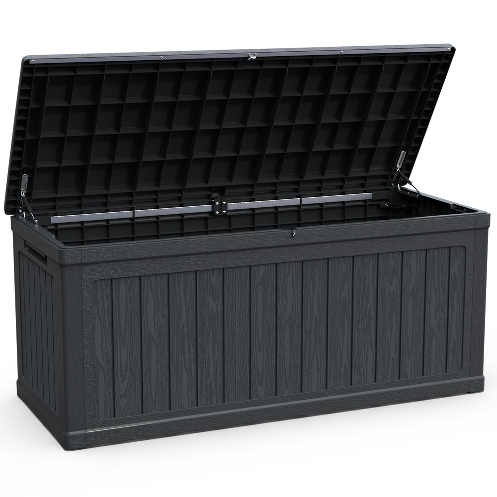 - 260 gallon capacity stores large outdoor cushions and garden tools