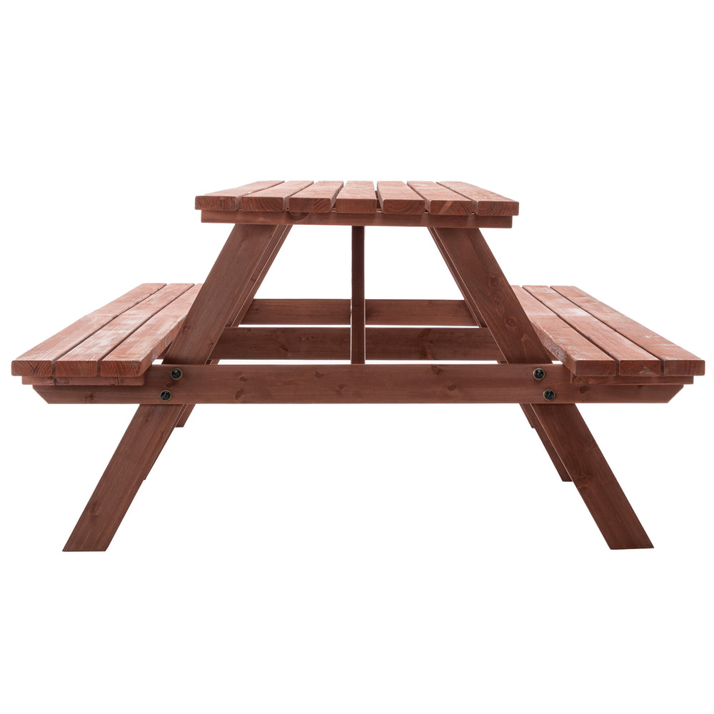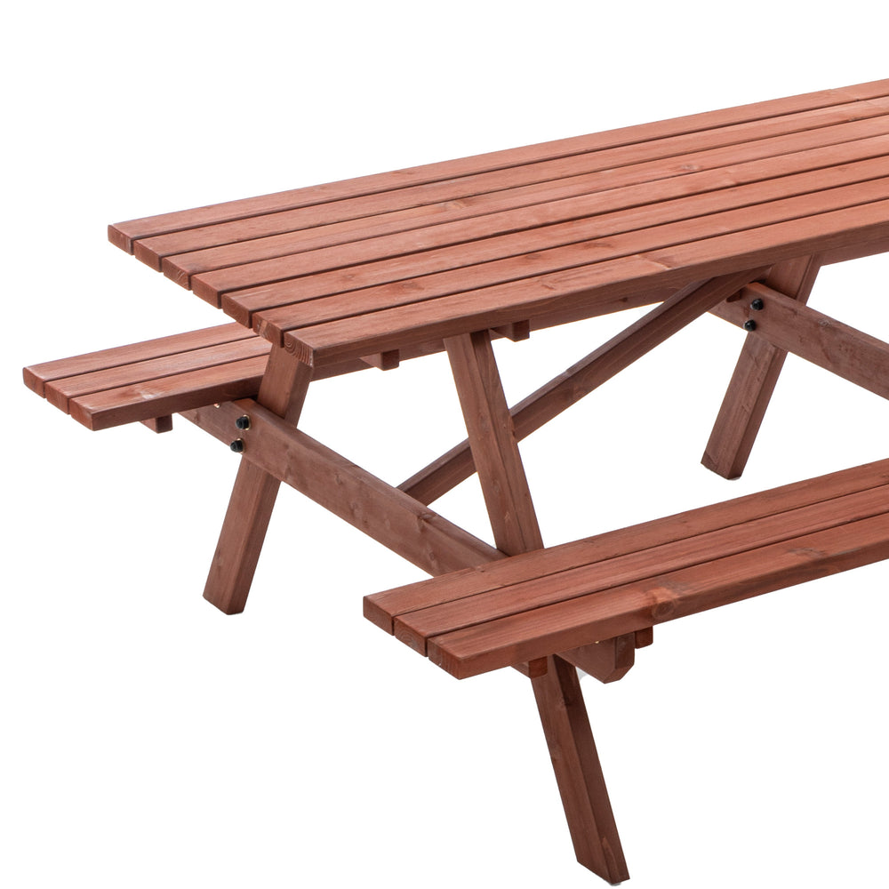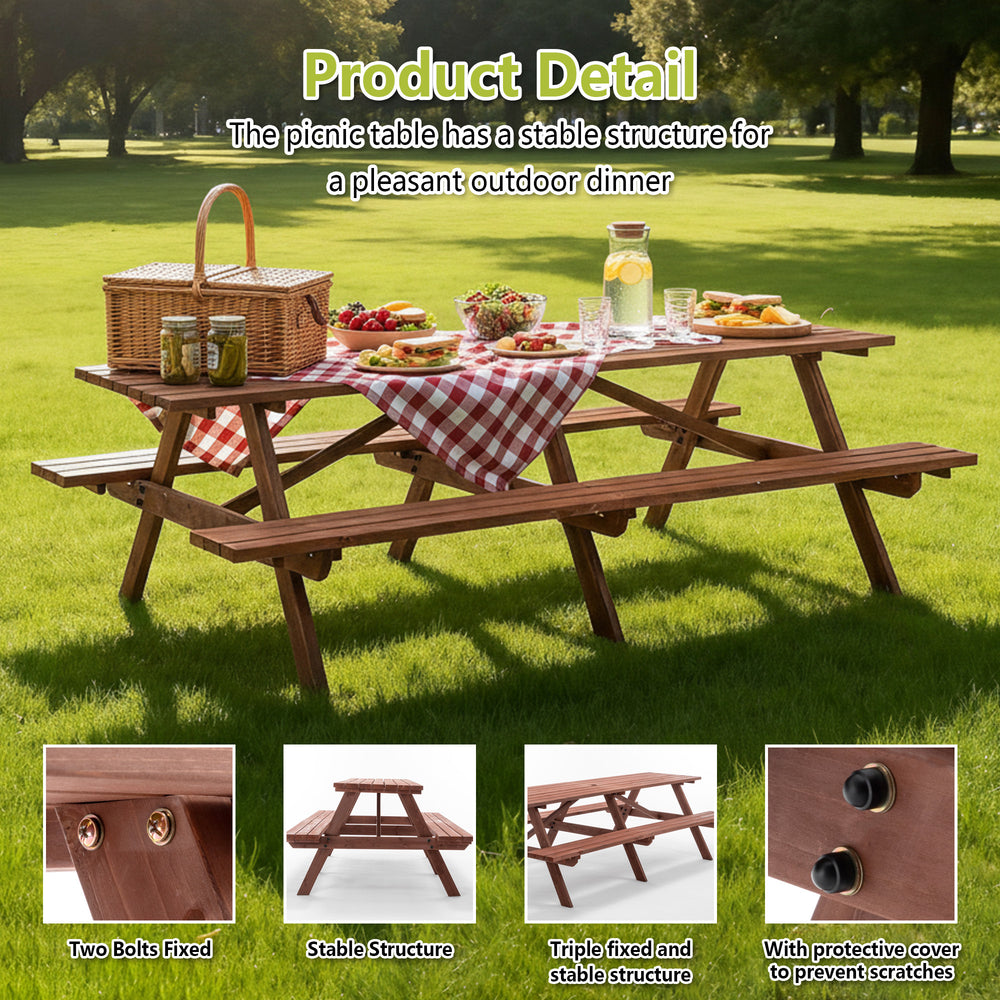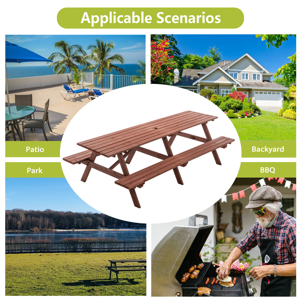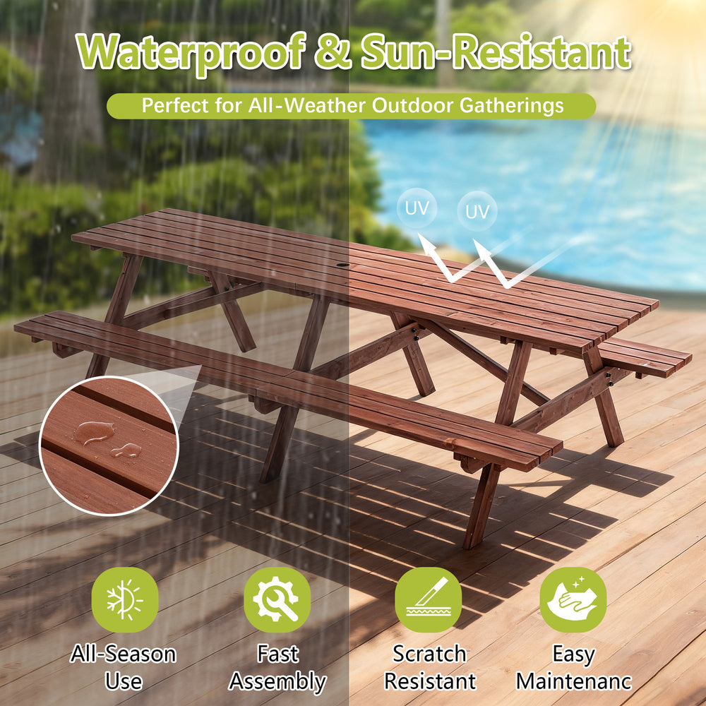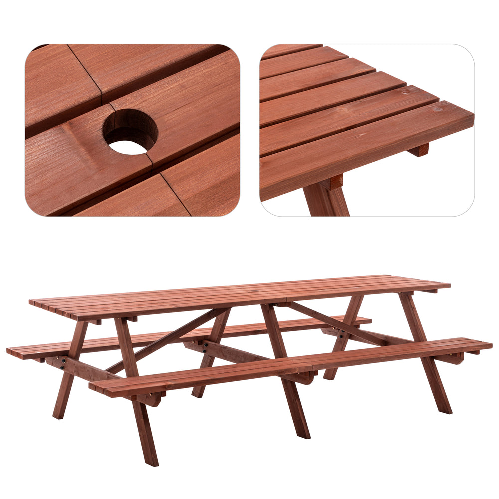 Host unforgettable gatherings with this sturdy outdoor picnic table set, crafted from durable fir wood with a rich rustic brown finish. The massive 95-inch long tabletop comfortably seats up to 12 adults, providing ample space for meals, games, and conversations. Designed as a unified structure with built-in benches, it eliminates the hassle of arranging separate seating and ensures lasting stability. A convenient umbrella hole in the center lets you add shade on sunny days, making your backyard events comfortable and weather-ready. Perfect for family reunions, cookouts, or casual outdoor dining, this elegant garden furniture set combines style, strength, and functionality to elevate your outdoor living experience. Elevate your backyard gatherings today.