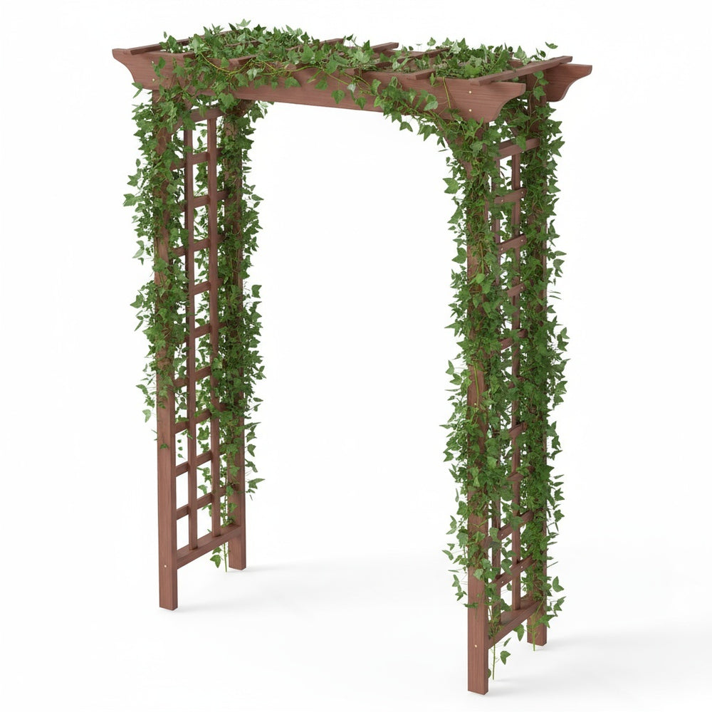 Sturdy solid fir wood arch with elegant brown finish offers durable outdoor use and a timeless design, ideal for weddings, garden events, and plant climbing. Its robust construction ensures stability and long-lasting performance in various outdoor settings.