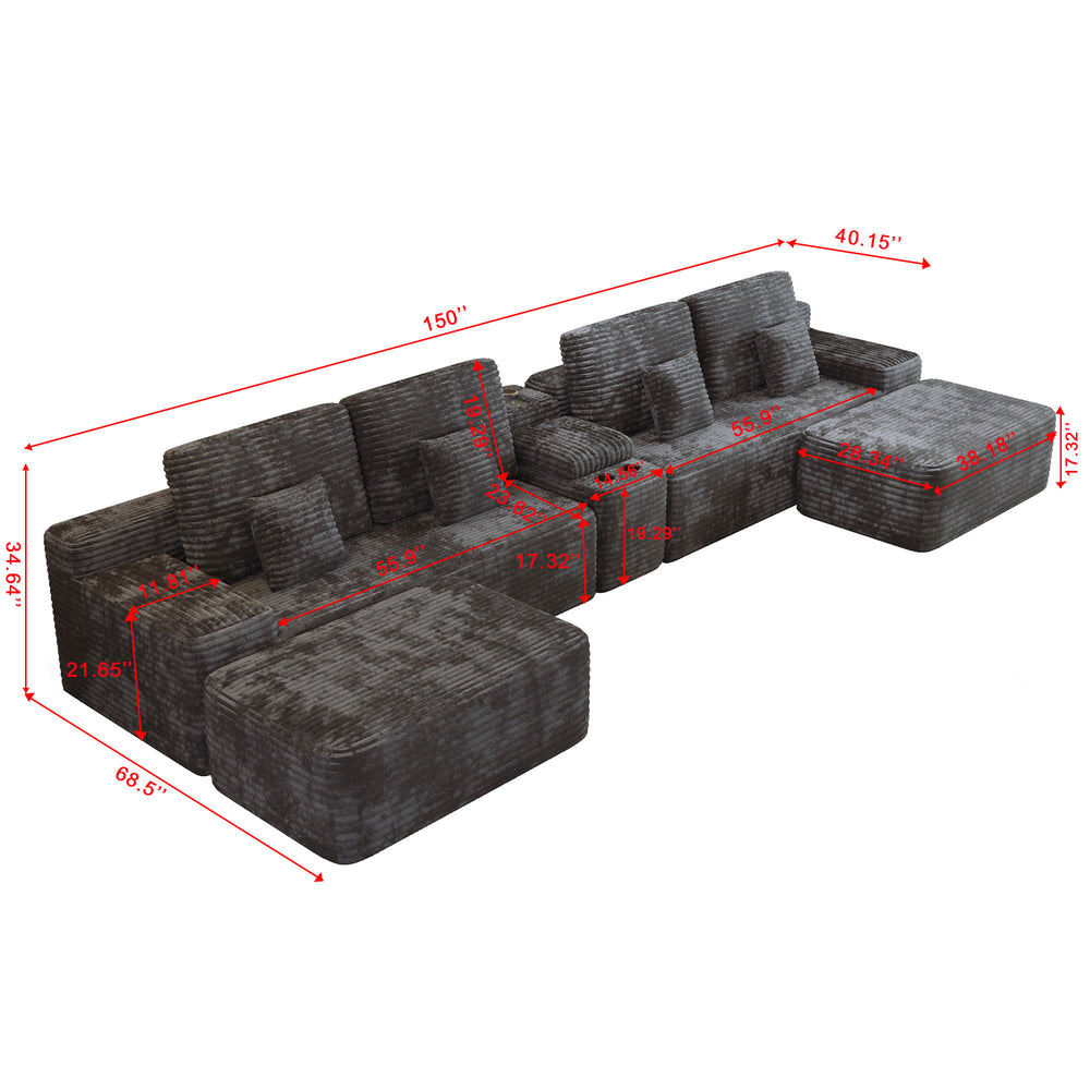 Designed for modern living rooms and open spaces, this 150-inch wide U-shaped sectional sofa combines style, function, and comfort. Upholstered in plush black corduroy polyester fabric and filled with medium-soft foam, it offers a cozy yet supportive seating experience for up to six people. The modular design lets you effortlessly transform the sectional into various shapes—including an L-shape or sleeper sofa—adapting perfectly to your home, office, or apartment. Two versatile ottomans and a removable 14.5-inch wide console add convenience and flexibility, while the console’s built-in storage, wireless charging, USB ports, cup holders, and Bluetooth speaker enhance entertainment and organization. Crafted to blend seamlessly into your primary living space, this sofa invites relaxation and connection. Elevate your home comfort and style today.