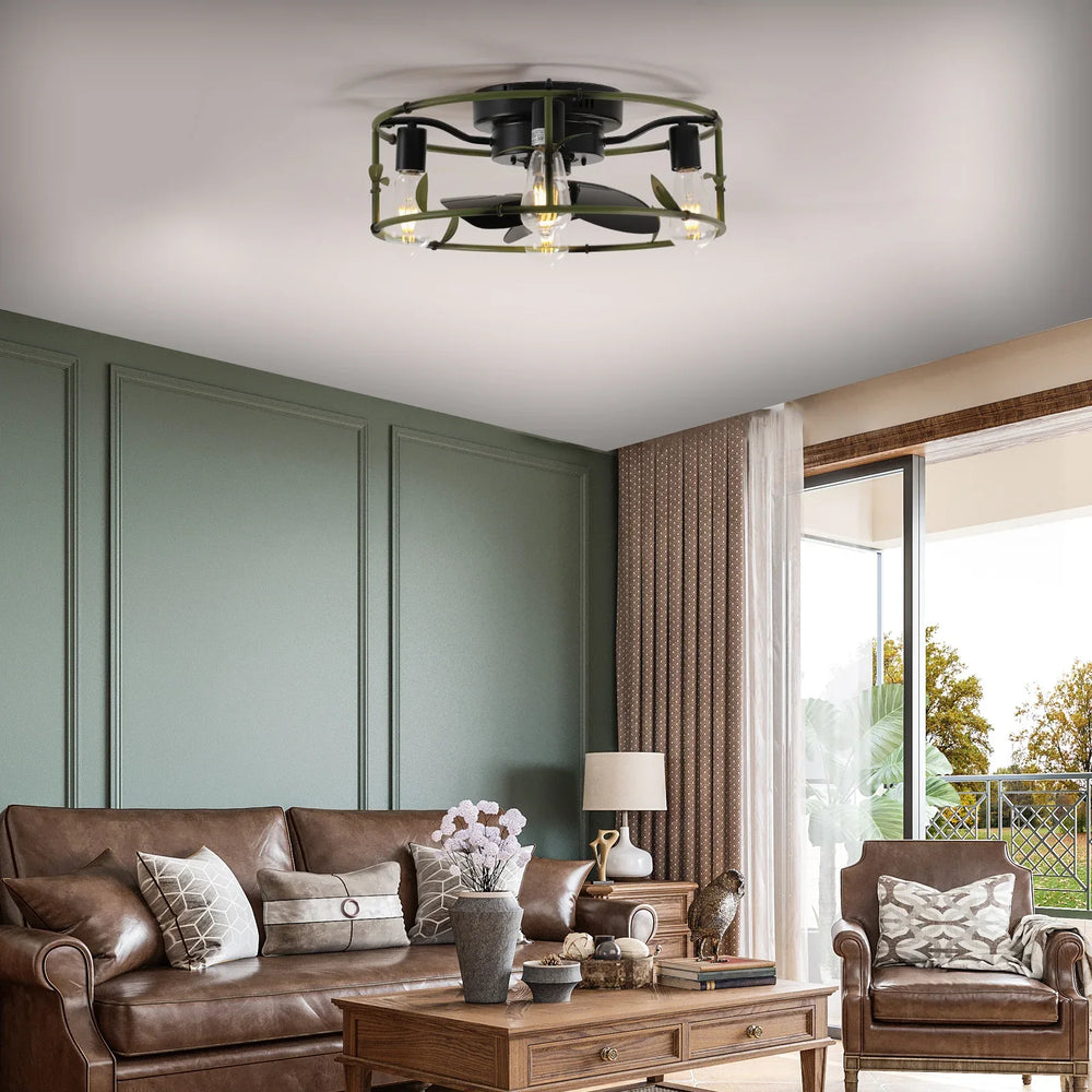Bring modern industrial charm and efficient air circulation to your bedroom or living room with this compact 19-inch ceiling fan. Inspired by bamboo design, its iron construction with copper and ABS accents delivers durability and a unique farmhouse aesthetic. The reversible silent DC motor offers 6-speed settings, allowing you to enjoy cooling breezes in the summer and redistribute warm air in the winter. This flush mount fan includes a caged light fixture compatible with four E26 bulbs (not included), providing customizable lighting to brighten your space. Controlled effortlessly via remote, it combines style, function, and convenience in one sleek package. Pre-assembled for quick installation, this fan elevates both ambiance and comfort in any room. Upgrade your home’s airflow and lighting today.