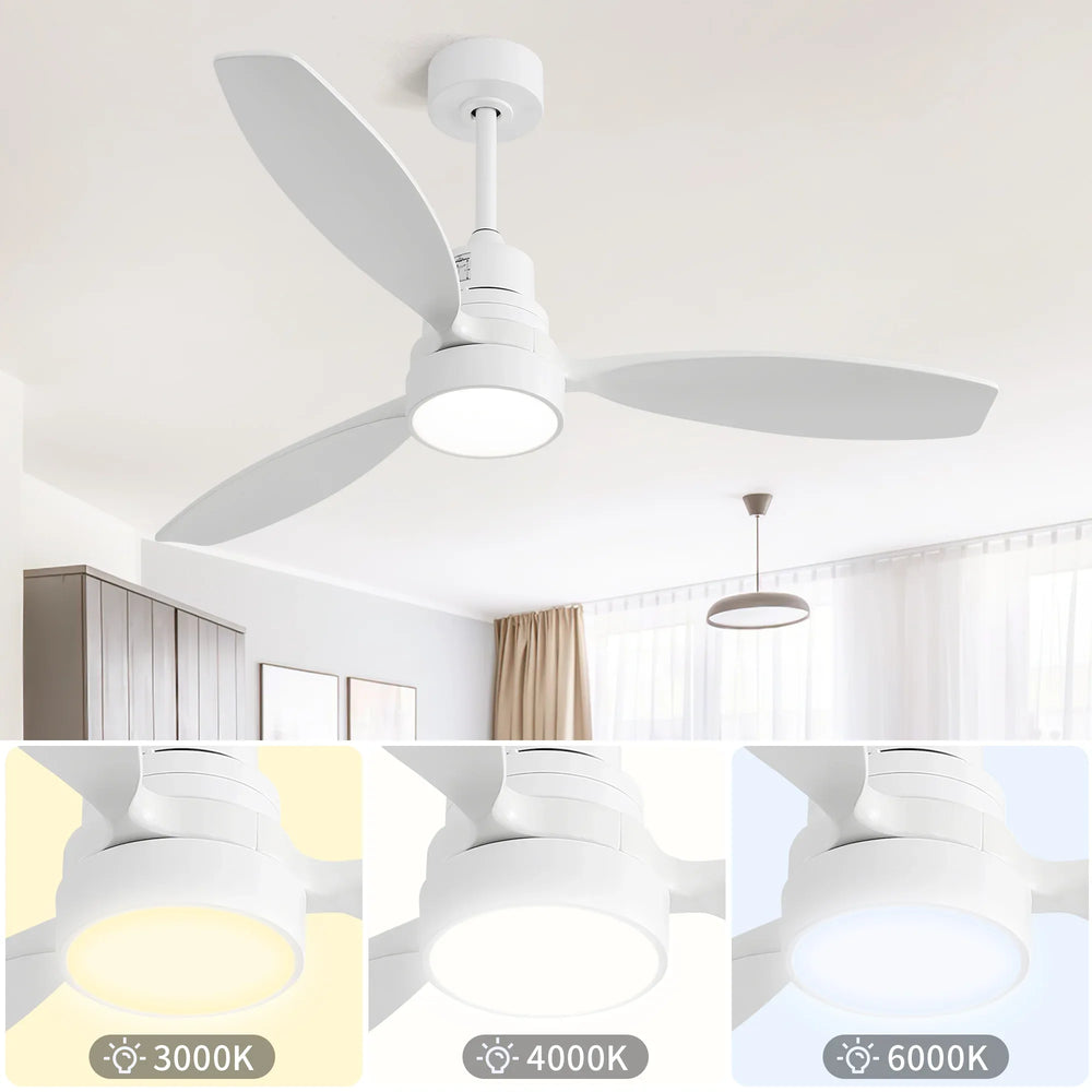 Stay cool and stylish with this 52-inch ceiling fan featuring three solid wood blades in a matte white finish. Equipped with an energy-efficient DC motor, it operates quietly while using 65% less energy than traditional fans—perfect for bedrooms, living rooms, offices, and more. The reversible airflow function lets you switch between cooling summer breezes and upward winter circulation, helping reduce energy costs year-round. Control the fan speed effortlessly using the included remote with convenient wall docking. An integrated 18W LED light with three color temperatures (3000K/4000K/6000K) brightens your space with energy-saving, long-lasting illumination. Combining metal durability with wooden elegance, this fan adds a timeless touch to any modern or vintage-inspired decor. Elevate your indoor climate control and lighting today.