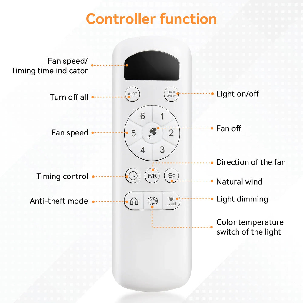 42-inch ceiling fan with dimmable 22W LED light and remote control offers quiet, energy-efficient airflow with reversible DC motor for year-round comfort. Features adjustable brightness and three light colors, ideal for living rooms and bedrooms.