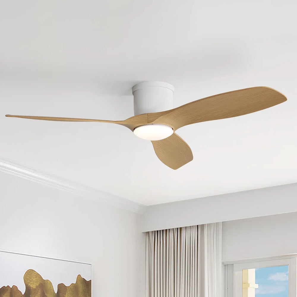Enhance your living space with this sleek 52 inch ceiling fan featuring energy-efficient ABS blades in a light wood grain finish and a clean white body. The low-profile flush mount design offers a seamless look perfect for modern and rustic interiors alike. Equipped with a powerful, ultra-quiet reversible DC motor, this fan delivers customizable airflow to keep you cool in summer and warm during winter. Integrated dimmable 18W LED lighting includes three color temperature settings to brighten your room while saving energy. Control every feature effortlessly with the included remote, allowing you to adjust fan speeds, set timers, and switch airflow directions with ease. Ideal for bedrooms, living rooms, home offices, and covered outdoor spaces, this fan brings style, comfort, and smart functionality together. Elevate your home environment today with this modern ceiling fan and light combo.