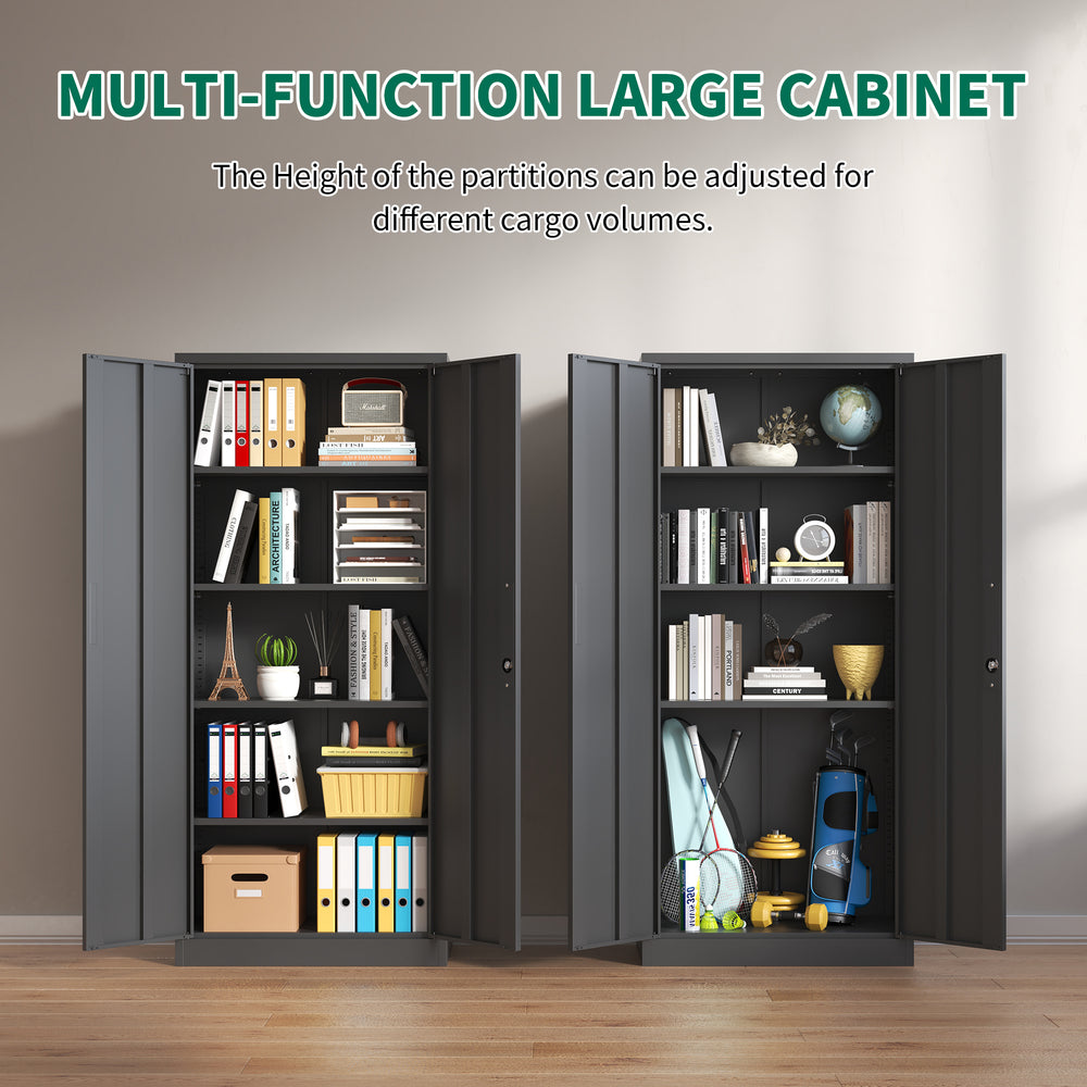 Upgrade your garage or office storage with this sturdy Heavy Metal Garage Storage Cabinet, crafted from 100% cold-rolled steel for exceptional durability. Its sleek black finish features a wear-resistant coating that keeps it looking sharp while protecting against everyday wear. Equipped with two lockable doors and four adjustable shelves that support up to 180 pounds each, this cabinet adapts perfectly to your storage needs. The enhanced three-point locking system secures your valuables, important documents, and tools with ease. Designed with safety in mind, the cabinet includes an anti-tipping feature to keep it stable even when loaded with heavy items. Easy to assemble with included instructions and videos, it’s the ideal solution for garages, utility rooms, offices, and schools. Elevate your storage space today and experience reliable organization with modern style.