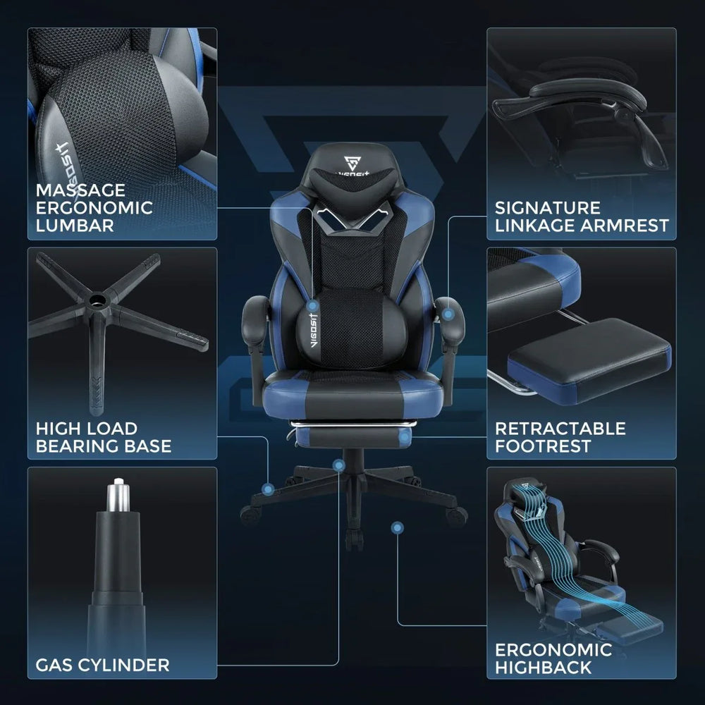 Omega Lifestyles ergonomic gaming chair features breathable PU leather and mesh, thickened foam cushioning, adjustable height, memory foam lumbar support, and a retractable footrest. Designed to relieve sedentary fatigue, it’s ideal for gaming, working, or relaxing in the bedroom.