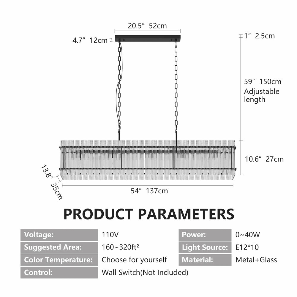 Illuminate your home with this stunning 10-light chandelier featuring a sleek black iron frame and unique corrugated crystal glass shades. The modern rectangular design casts captivating light patterns, adding a sophisticated touch to dining rooms, kitchens, living rooms, or home offices. Its adjustable hanging height supports ceilings from 8 to 13 feet, making it versatile for various room sizes between 215 to 322 square feet. Crafted with premium materials and meticulous handmade details, this semi-flush mount fixture is both elegant and durable. Equipped with energy-efficient LED lights controlled by a simple push button, it combines style with practicality. Transform your space and enjoy a refined ambiance—elevate your home décor today.