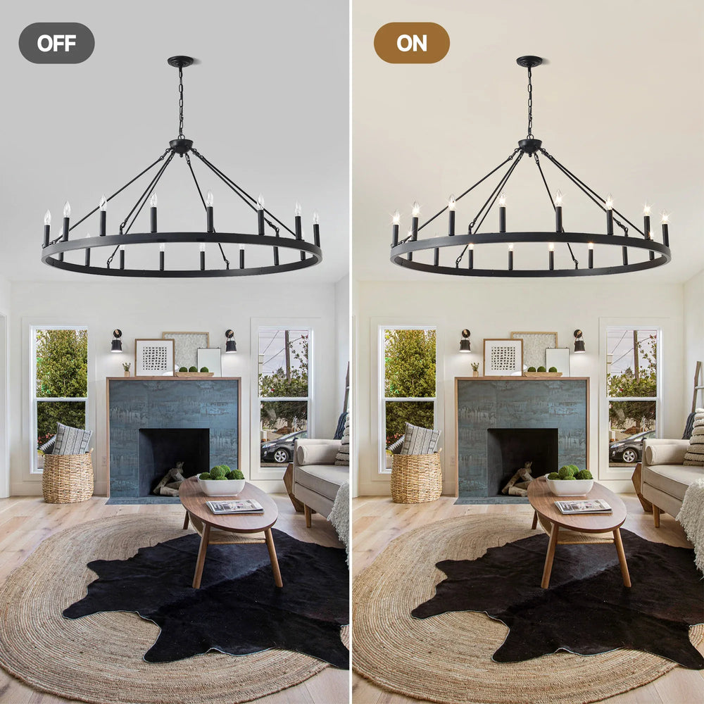 Bring rustic charm and modern elegance to your living space with this striking matte black wagon wheel chandelier. Crafted from sturdy iron and metal, the round frame exudes a vintage industrial style that fits perfectly in dining rooms, kitchens, living rooms, or bar areas. Designed to accommodate 18 E12 bulbs (not included), it delivers customizable brightness with recommended LED options, ranging from warm candlelight tones of 1000K to 2600K. The chandelier’s 53.15-inch diameter offers impressive presence without overpowering your space. Adjustable chains enable easy height customization for ideal placement. With straightforward assembly and hardwired installation, upgrade your home lighting effortlessly. Illuminate your space with both style and function—elevate your interiors today.