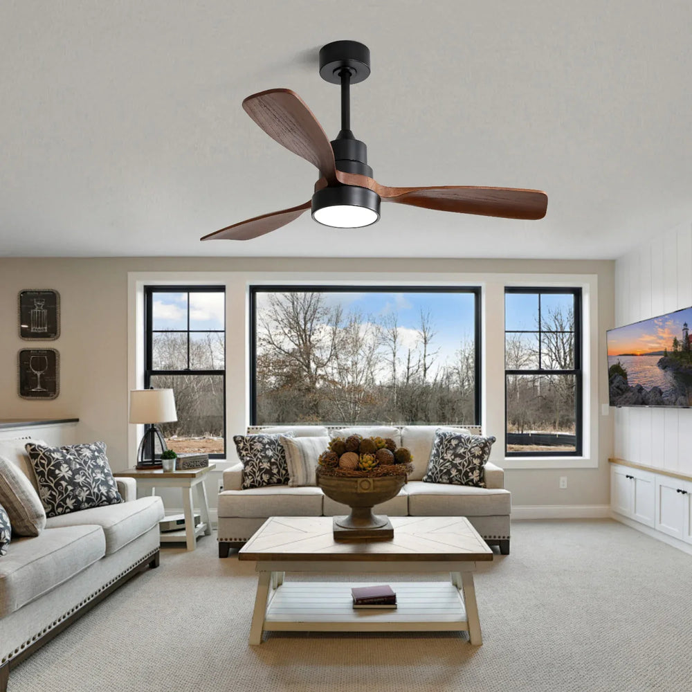 Experience efficient, year-round comfort with this 48-inch ceiling fan designed for medium to large rooms. Crafted with three solid walnut wood blades and a sleek black metal body, it adds a touch of rustic elegance to any living room, bedroom, or office. The energy-saving reversible DC motor provides powerful, whisper-quiet airflow to keep you cool during summer and cozy in winter. Equipped with a 3CCT LED light and convenient remote control, you can easily adjust fan speeds and lighting settings without leaving your seat. Whether mounted with the included downrods (5’, 10’, or 24’), it’s perfect for indoor spaces or covered patios. Elevate your home’s style and comfort today.