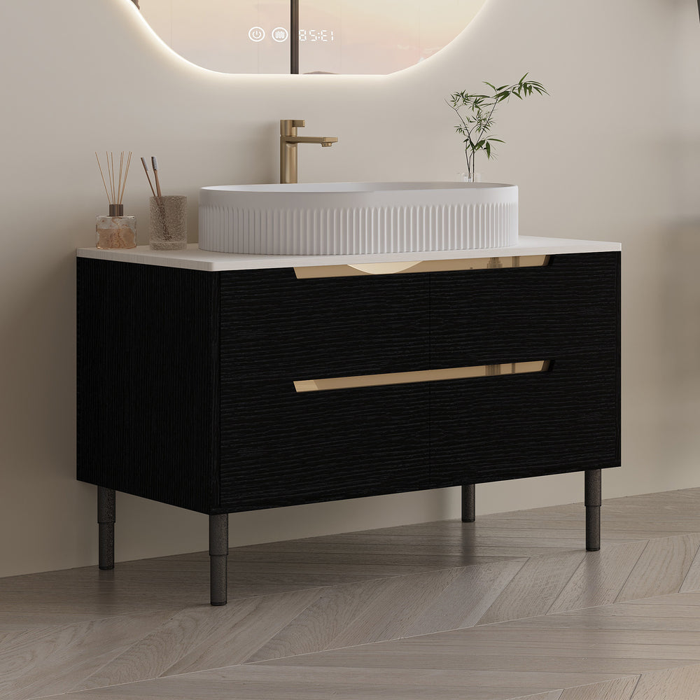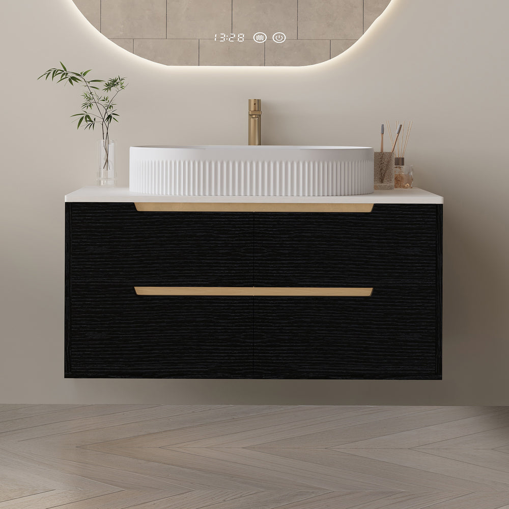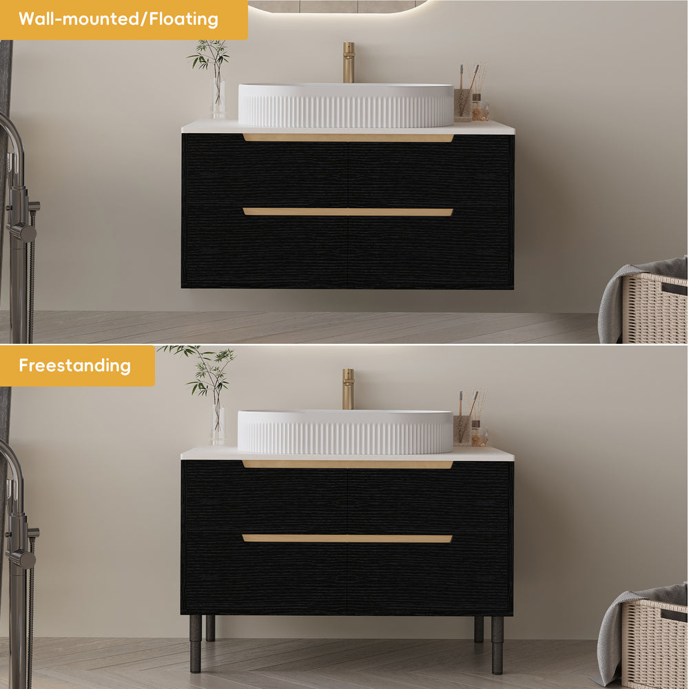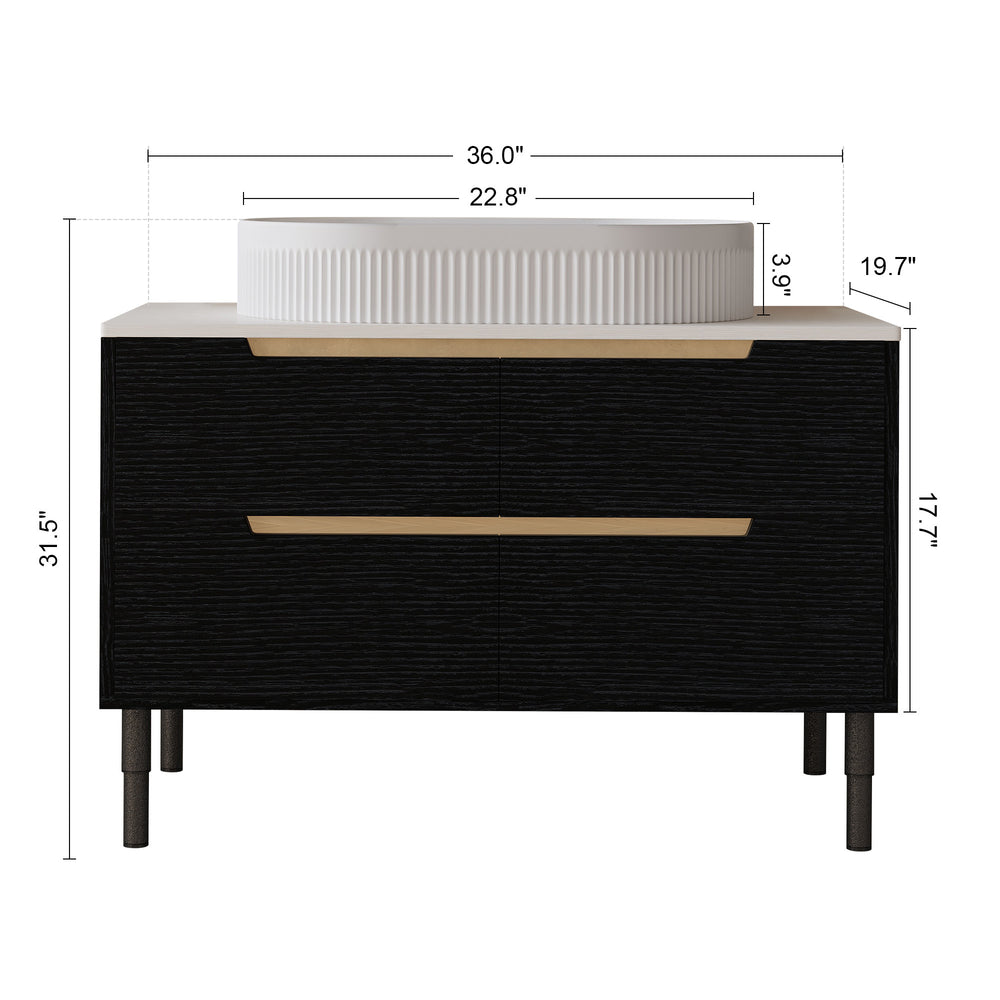 Upgrade your bathroom with this 36-inch contemporary vanity that perfectly balances style and functionality. Designed for flexible installation, it can be mounted on the wall for a sleek, modern look or placed freestanding to suit classic bathroom layouts. Featuring a seamless ceramic integrated sink, this vanity offers easy cleaning while resisting stains and mold for lasting freshness. Constructed with waterproof engineered wood and stainless steel elements, it endures humid environments without warping or swelling. Four spacious soft-close drawers provide quiet, organized storage for all your essentials. Adjustable metal legs ensure stable leveling on uneven floors, making installation effortless. This modern bathroom vanity combines durable materials, practical design, and elegant finishes in black, gold, or white to create a polished, luxurious feel. Elevate your bathroom experience today with a vanity that works as hard as it looks.