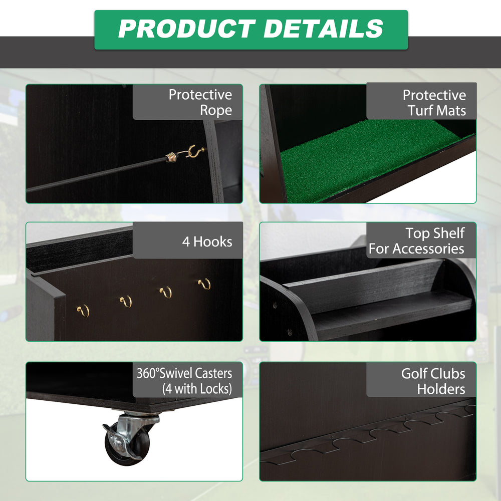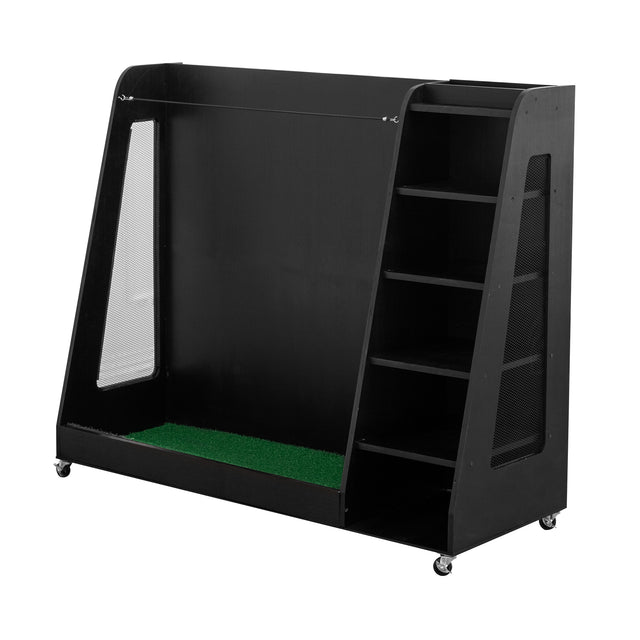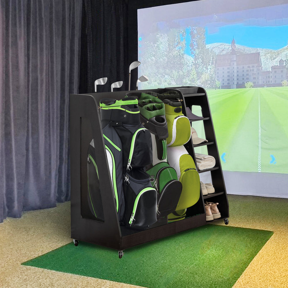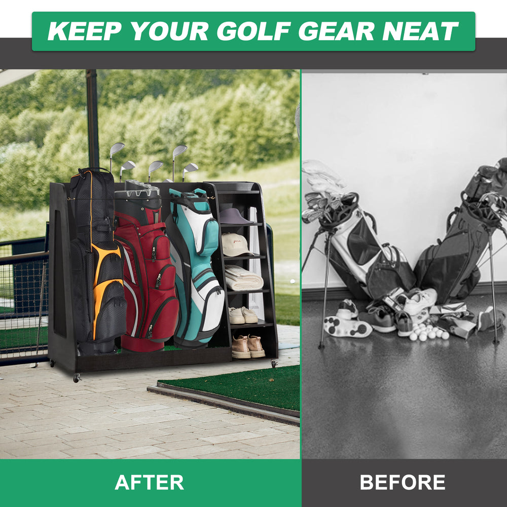 Keep your golf equipment neatly stored and easily accessible with this stylish wooden golf bag storage rack. Designed to hold up to 3 stand bags vertically and securely store 14+ golf clubs, it streamlines organization for all your essential gear. Crafted from durable wood with a sleek black finish, this rack adds both functionality and a modern touch to your garage or indoor space. Multiple compartments accommodate 4-5 pairs of golf shoes, over 50 golf balls, and accessories like gloves and hats, helping you declutter and protect your gear. Its sturdy construction and smart layout ensure your clubs and equipment stay stable, damage-free, and ready for your next round. Easy to assemble in just 15 minutes, this versatile rack also doubles as a great organizer for other sports equipment or tools. Elevate your storage solution today and enjoy a clean, orderly space for all your golf needs.