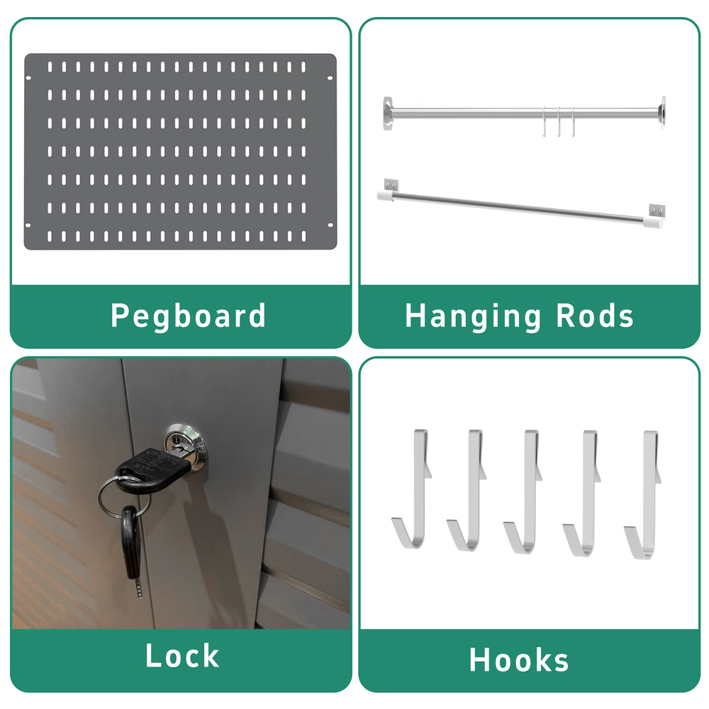 - Ample Storage Space: Includes 3 adjustable shelves, 1 upper shelf, pegboard, and 2 hanging rods for organized storage.