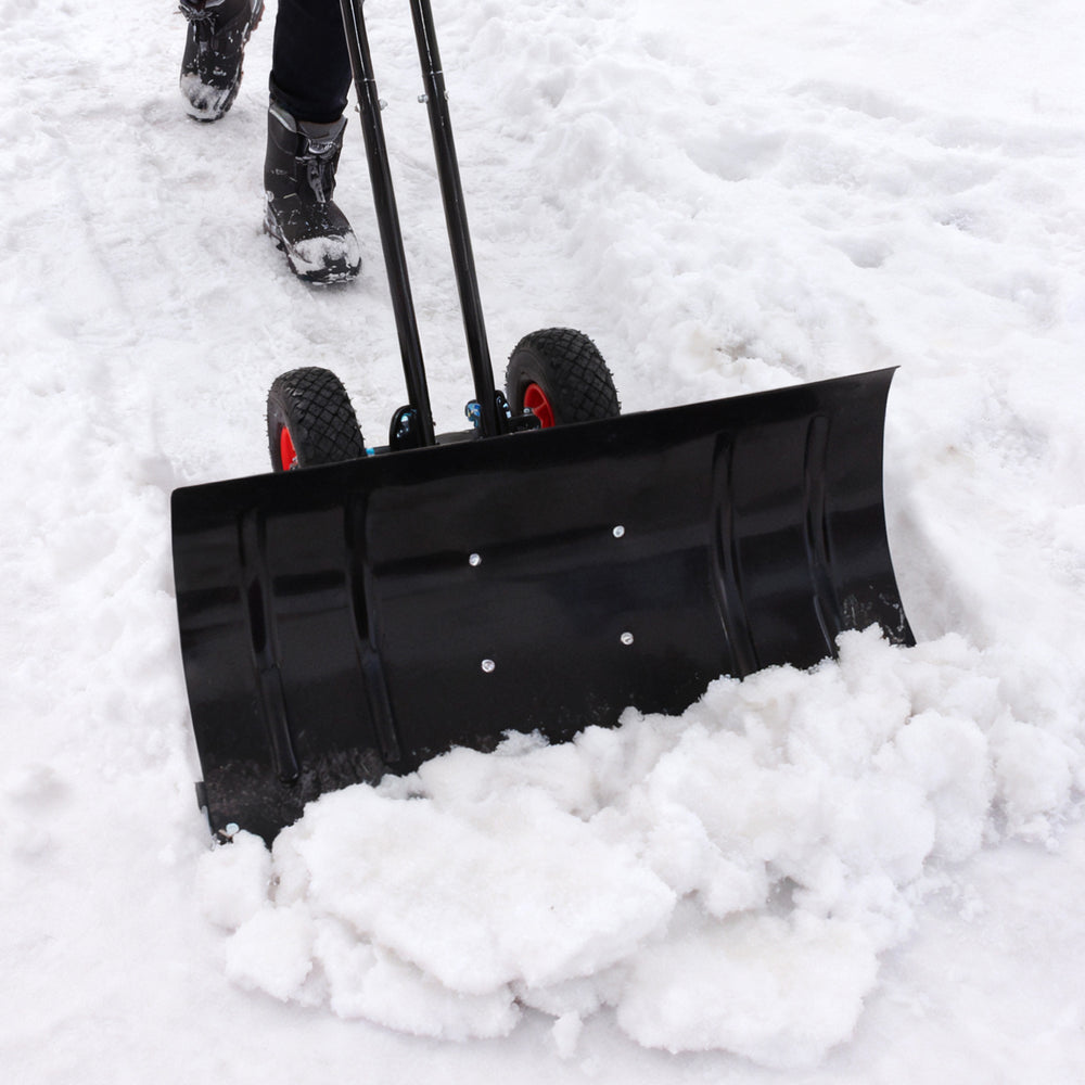 Glide through snow effortlessly with smooth rolling wheels and wide blade