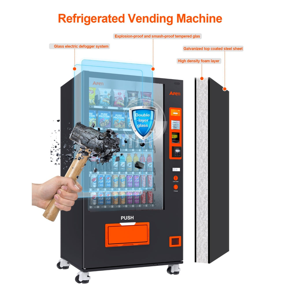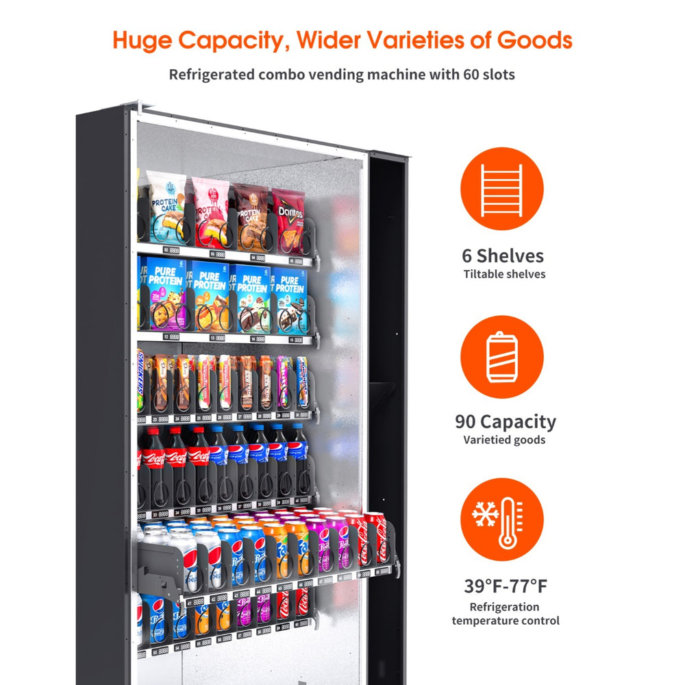 Boost your business with this commercial refrigerated combo vending machine, designed to deliver a wide selection of snacks and beverages conveniently. Featuring six spacious shelves and 60 slots, it holds up to 378 items to satisfy diverse customer preferences. The powerful compressor cooling system maintains temperatures between 39°F and 77°F, ensuring fresh and chilled drinks all day. Equipped with advanced payment options including coin, bill acceptor, and cashless card reader supporting Visa, Mastercard, Apple Pay, and more, it guarantees fast and secure transactions. Durable steel frame combined with tempered glass front enhances longevity and product visibility. The caster design makes it easy to maneuver and stabilize on uneven surfaces, perfect for locations like offices, hospitals, and airports. Increase sales and customer satisfaction with this reliable, high-capacity vending solution. Elevate your vending business today.
