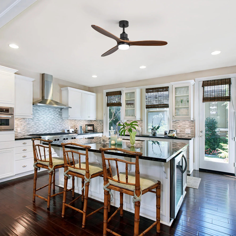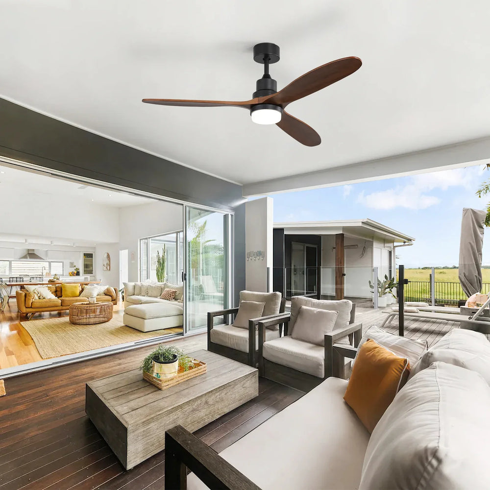 Modern wooden ceiling fan features three solid walnut blades and a silent reversible DC motor for year-round comfort. Integrated dimmable 18W LED lighting offers adjustable ambiance, making it ideal for living rooms, bedrooms, patios, and cafes.