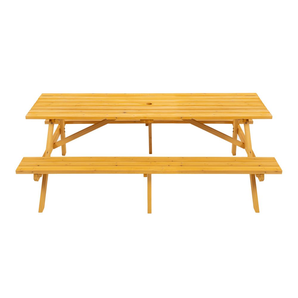 Bring family and friends together around this classic wooden picnic table designed for outdoor fun and relaxation. Crafted from durable wood, it offers a spacious surface measuring 75 inches long by 50 inches wide, comfortably seating up to eight people. Built-in benches provide convenient, comfortable seating for couples or groups without the hassle of extra chairs. The integrated 2-inch diameter umbrella hole allows you to add shade for sunny days, making every meal or gathering more enjoyable. Smooth, rounded edges enhance safety, while the robust construction supports a heavy-duty capacity of 2,220 pounds, ensuring stability and lasting use. Whether hosting backyard parties, family picnics, or community events, this picnic table is the perfect addition to your garden or campsite. Elevate your outdoor experience today with this versatile, attractive dining solution.