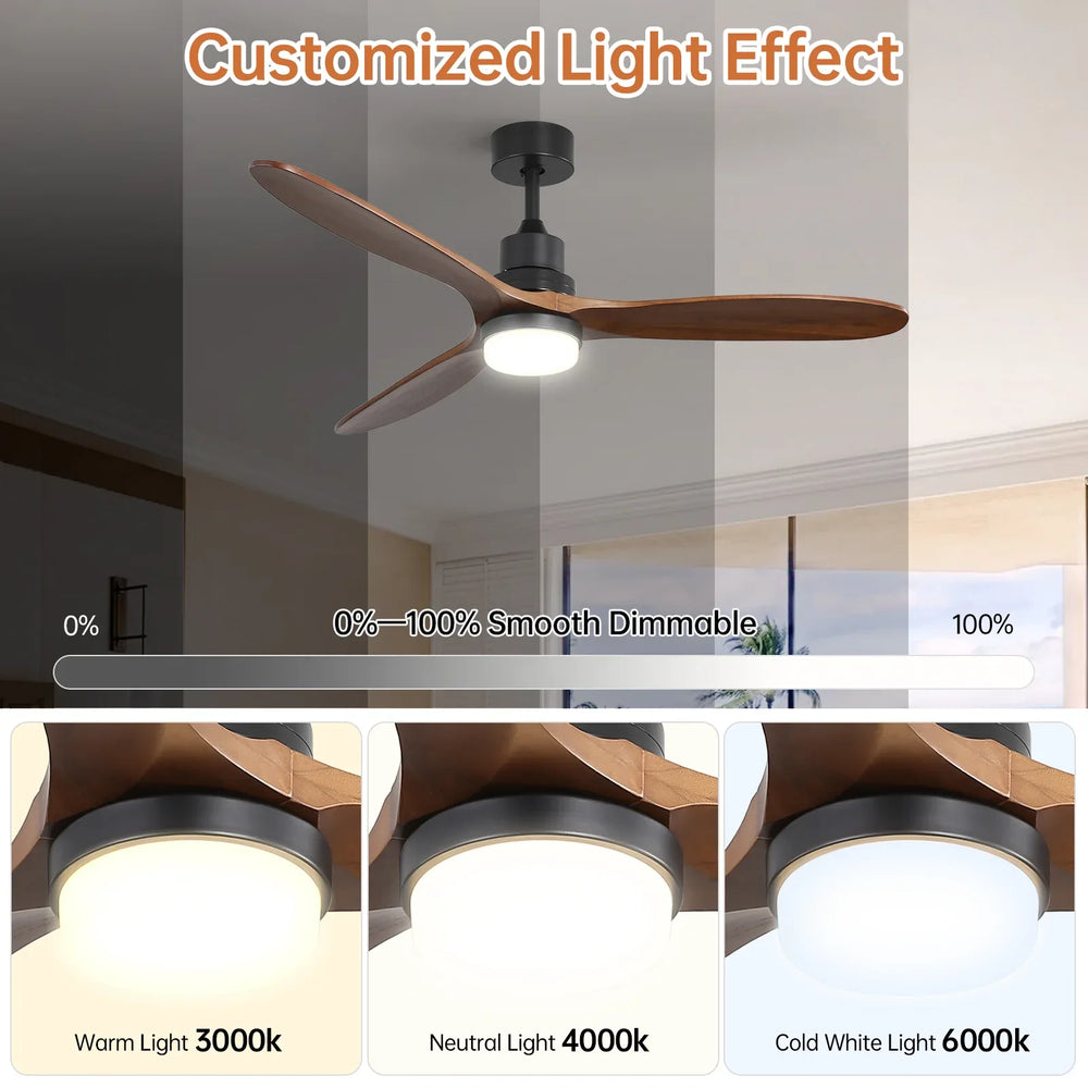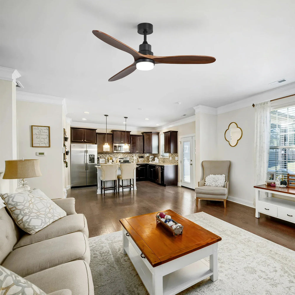 Modern 60-inch ceiling fan features solid walnut wood blades and a matte black metal frame for stylish airflow. Energy-efficient DC motor ensures quiet operation, while integrated dimmable LED lighting creates customizable ambiance—ideal for living rooms, bedrooms, patios, and more.