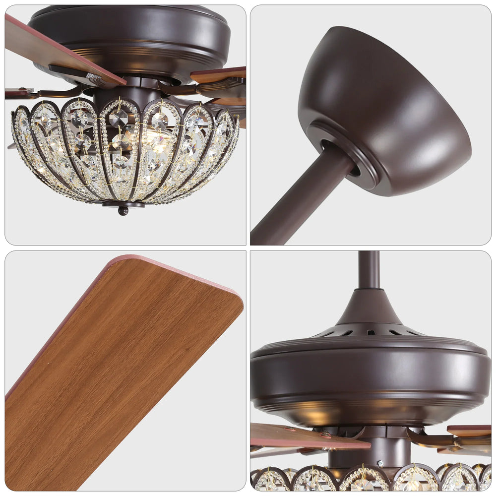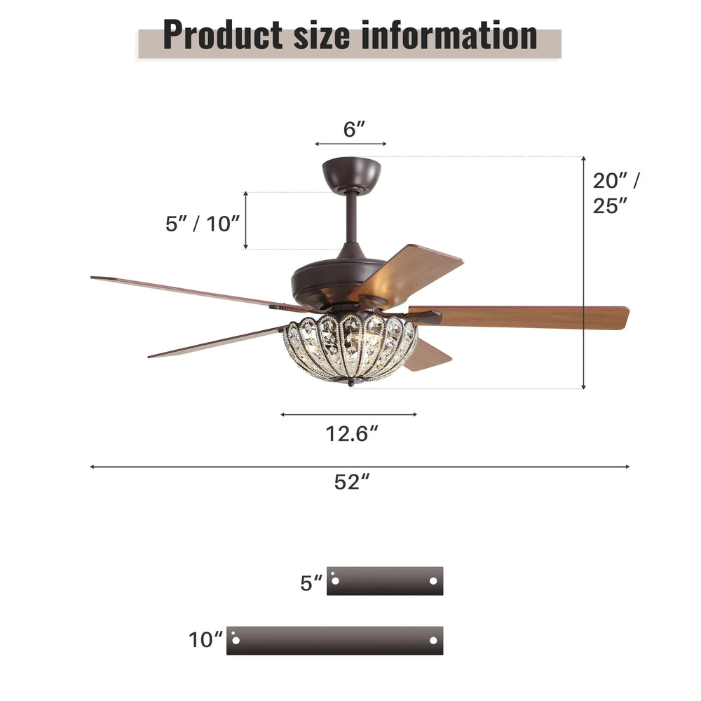 Elevate your living space with this vintage-inspired 52-inch ceiling fan, featuring a rich coffee-brown finish and elegant crystal-accented wrought iron light fixture. Crafted with five premium plywood blades, this fan ensures powerful, whisper-quiet airflow thanks to its advanced energy-efficient DC motor operating below 30dB. Enjoy customizable comfort with six-speed settings, including a natural wind mode, all easily controlled via the included remote. The reversible motor provides refreshing summer cooling and effective winter warmth circulation, optimizing your home’s climate year-round. Plus, two hanging rods (5-foot and 10-foot) offer flexible installation options to fit any ceiling height. The beautiful crystal light shade houses three E12 sockets, letting you personalize your ambient lighting (bulbs not included). Combine classic aesthetics with modern technology to bring effortless comfort and charm to your bedroom, dining room, or living area. Elevate your relaxation today with this expertly designed ceiling fan.