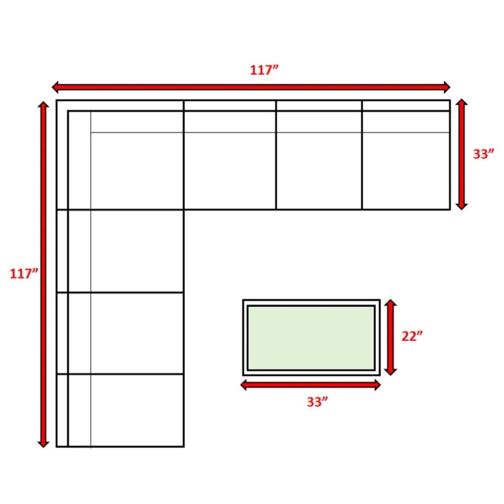 Overall Dimensions Sofa: 117 inches W x 117 inches D x 26 inches H (297 x 297 x 66 cm)
