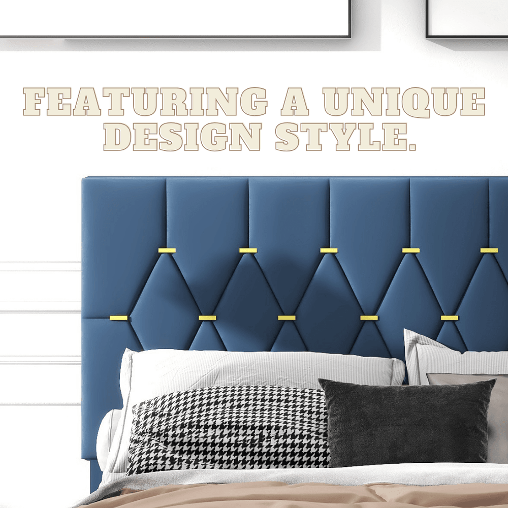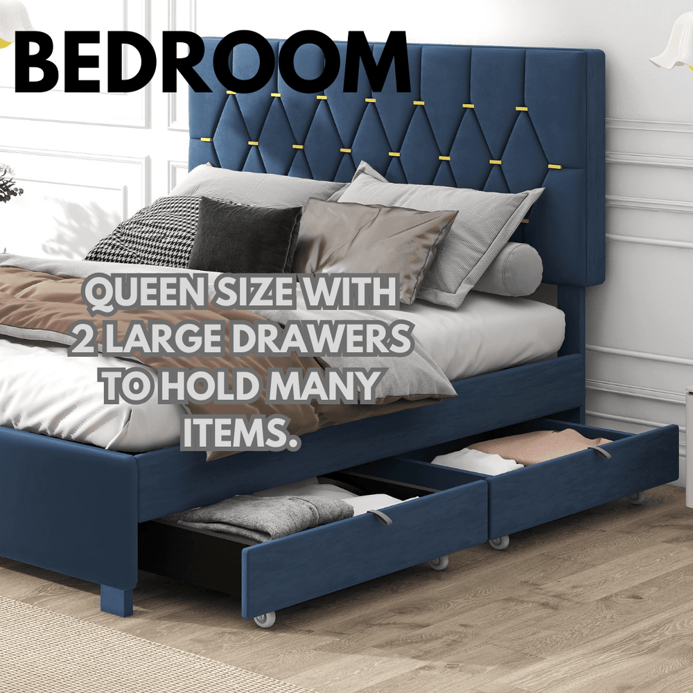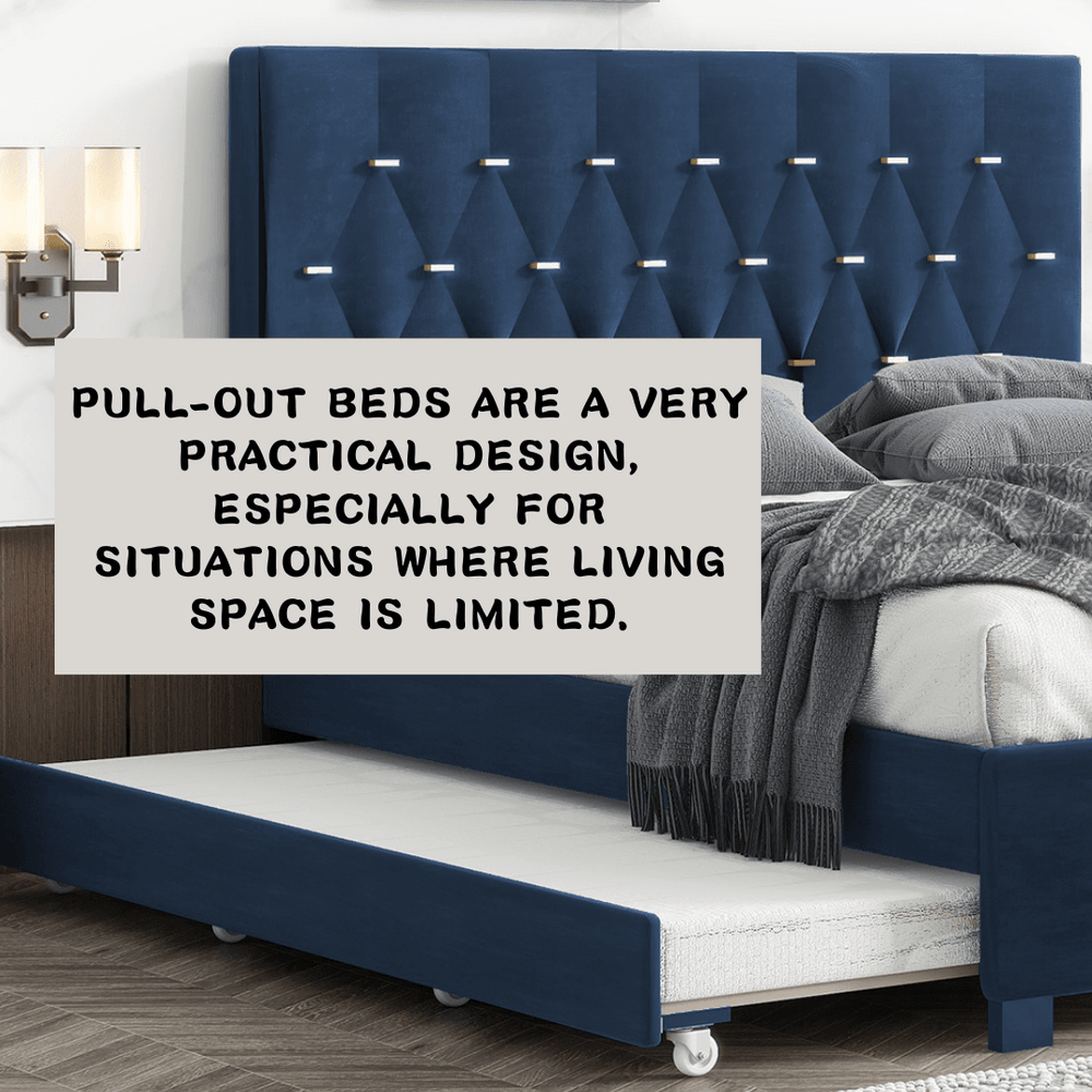 Elevate your bedroom with this contemporary queen bed featuring luxurious blue velvet upholstery and a solid wood frame for lasting durability. Designed with versatility in mind, it includes a convenient twin-size pull-out trundle perfect for guests or extra sleeping space. Two spacious storage drawers keep your essentials organized, making it ideal for smaller rooms or busy households. The sturdy slat system supports your mattress without the need for a box spring, providing stable comfort and easy setup. Its espresso-toned wood accents and gold button bar add a refined touch to any bedroom décor. Adjustable trundle and drawer positions ensure seamless customization to fit your room layout. Mattresses are not included, allowing you to choose the perfect mattress for your comfort. Upgrade your space with this multifunctional velvet bed and enjoy both style and smart storage solutions today.