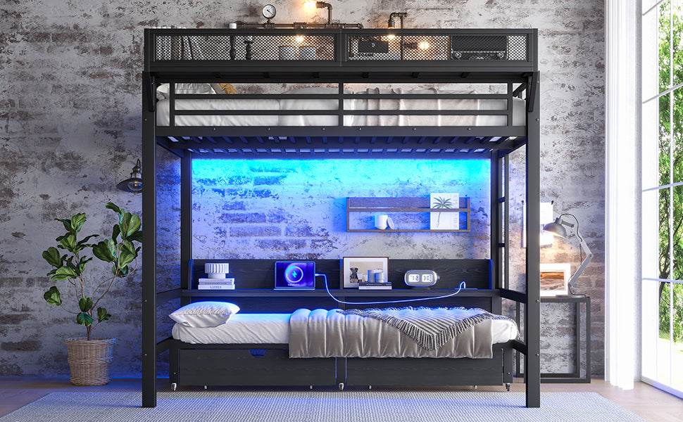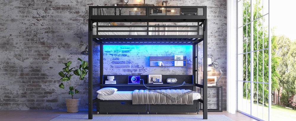 This versatile queen over queen metal bunk bed is designed to bring smart functionality and sleek style to your bedroom. Crafted with durable metal and MDF, it supports heavy use while maintaining a modern black finish that complements any décor. The lower queen bed converts effortlessly into a sofa, perfect for creating a multi-use living area ideal for guests or shared spaces. Built-in shelves and spacious under-bed drawers offer ample storage for books, clothes, or essentials, helping keep your room organized and clutter-free. Integrated LED lighting and USB ports add convenience for nighttime reading or device charging—all within easy reach. Safety features like full-length guardrails and a sturdy ladder ensure peace of mind for families and roommates. With easy assembly and a sturdy frame, this bunk bed blends practicality with comfort for modern living. Elevate your space today with this multifunctional bunk bed solution.
