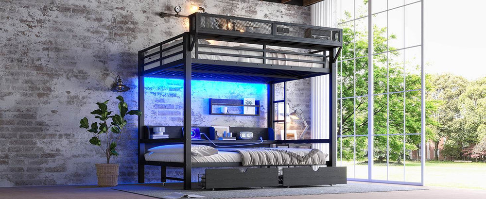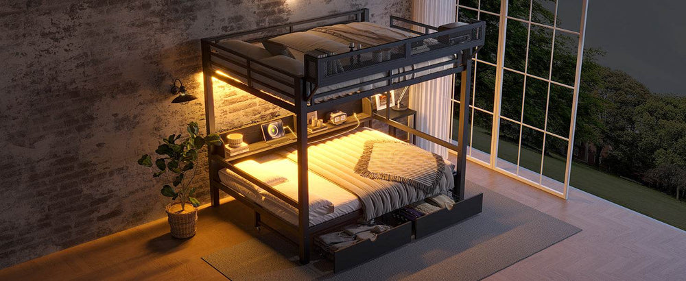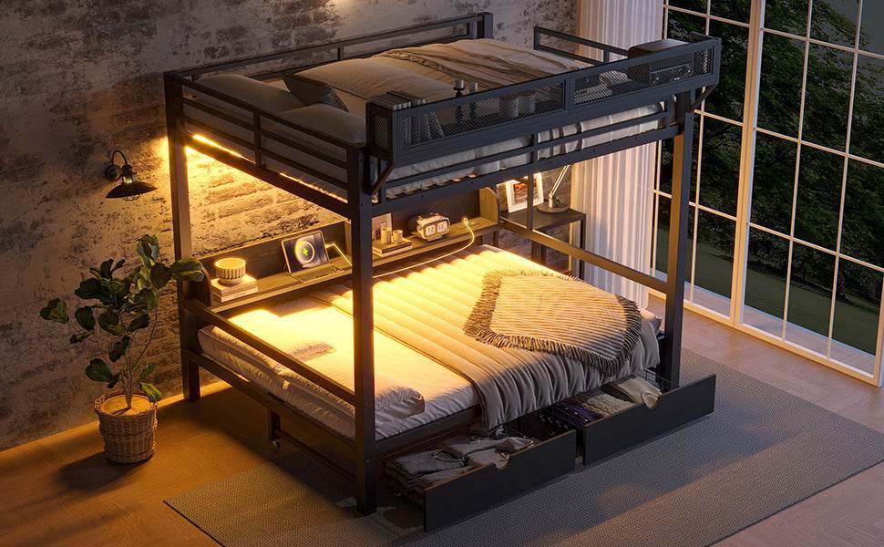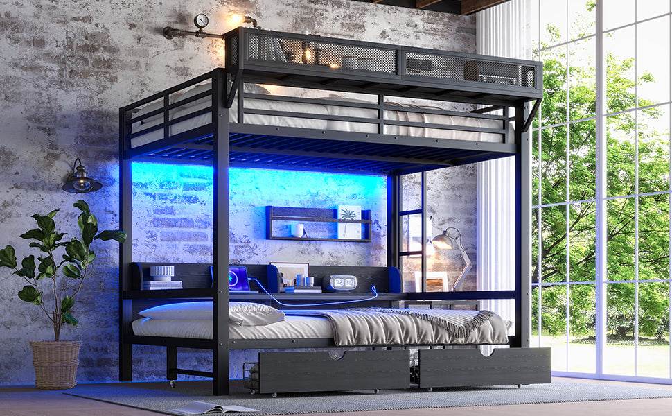 Queen Over Queen Metal Bunk Bed With Storage Drawers And LED Lights