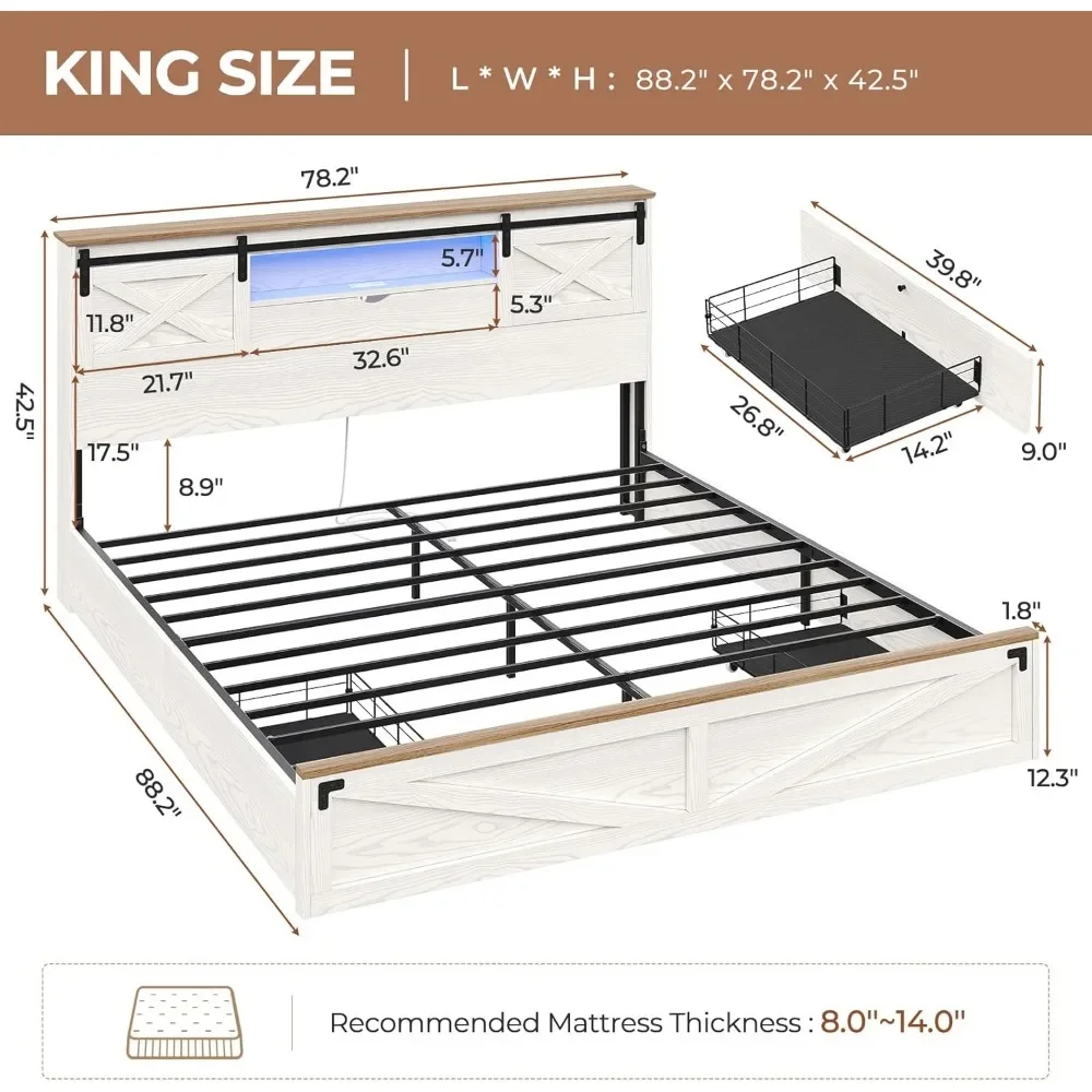 Bed Frame King Size with LED Lights and Charging Station, Wooden King Bed with 2 Storage Drawers, Rustic Headboard - White / King / United States is backordered and will ship as soon as it is back in stock.