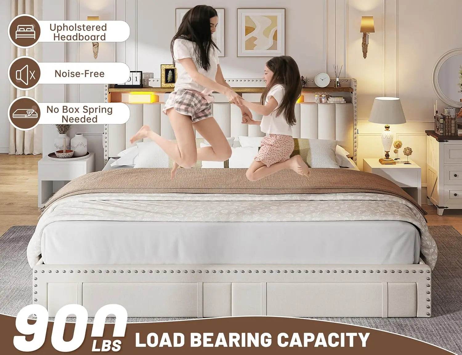 - 2-Tier Shelves on Headboard: Perfect for bedside essentials like phones, glasses, and books