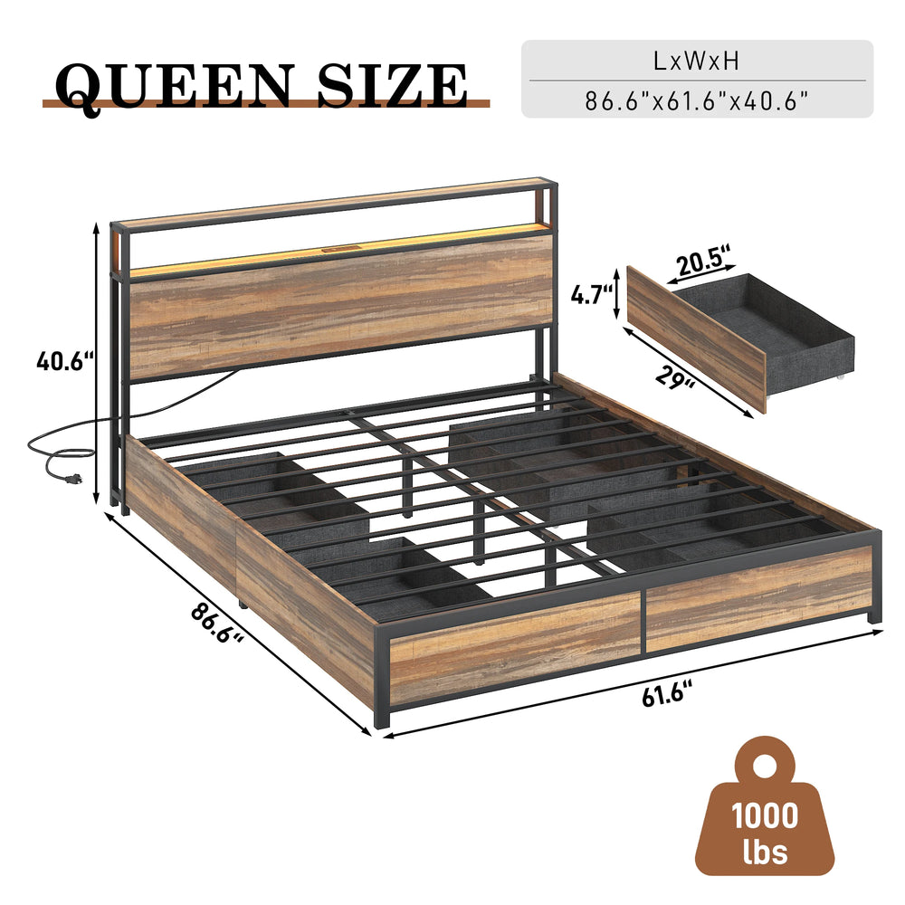 Experience the perfect blend of style, function, and convenience with this American country-style LED platform bed frame. Crafted from durable iron and high-quality MDF board, it provides stable support for mattresses without the need for a box spring, accommodating up to 1,100 pounds. The built-in RGB LED headboard delivers customizable ambiance with 16 colors and 4 modes, adjustable via remote or app—ideal for setting the perfect mood. Stay connected and powered with two integrated USB ports and outlets conveniently placed on the two-tier shelf headboard. Four spacious storage drawers beneath the bed offer ample room to keep your bedroom organized and clutter-free. Designed for quiet comfort, its noise-free structure features silent cotton padding and protective feet to prevent floor damage. Easy to assemble with clear instructions, this multifunctional bed frame elevates your sleep space by combining tech-savvy features and ample storage to meet everyday needs. Elevate your bedroom today with this stylish, smart bed frame solution.