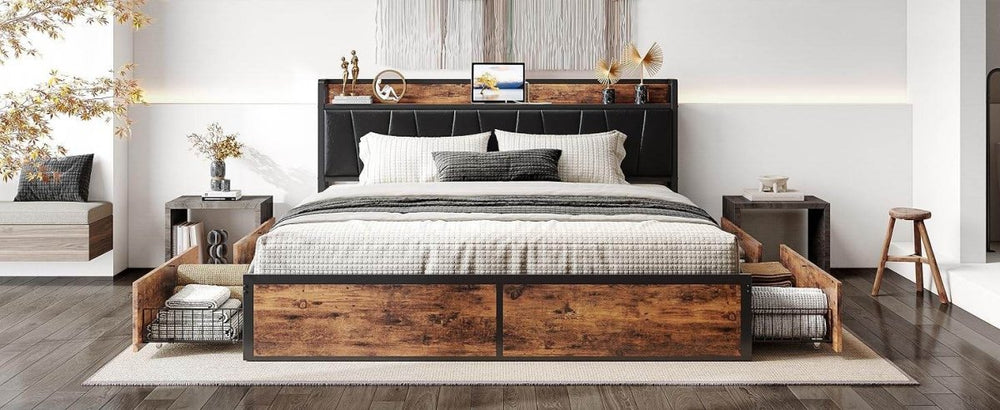 LIKIMIO King/CaliforniaKing Bed Frame with Storage Drawers, Platform Bed with Charged Headboard, No Box Spring Needed - Omega Lifestyles