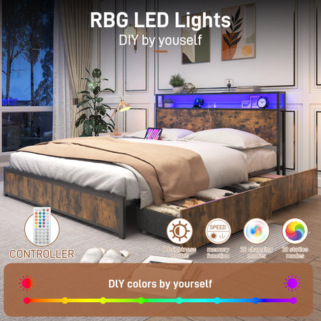 Metal Platform Bed Frame with Storage Headboard, 4 Drawers, LED Lights, and Charging Station