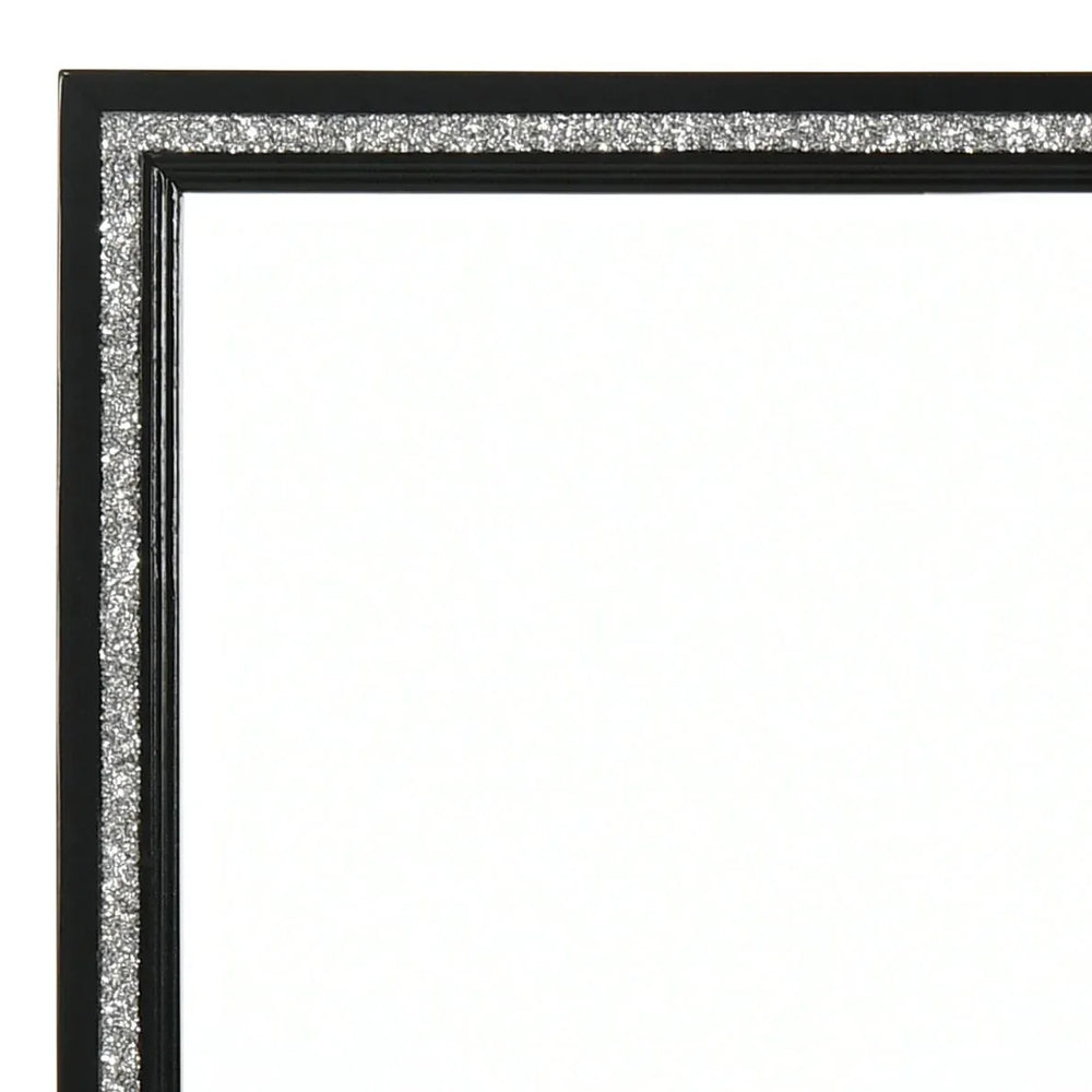Omega Lifestyles black synthetic wood dresser mirror features a beveled glass surface with shimmering silver trim, adding clarity and modern elegance. Ideal for vanities or living areas, it enhances room brightness and dimension while reflecting a sophisticated contemporary style.