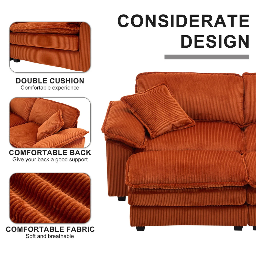 Bring warmth and style to your living room with this inviting 2-seat corduroy sofa. Upholstered in soft, textured corduroy fabric, its deep seats and high-resilience foam with pocket spring cushioning provide exceptional comfort and support for long-lasting relaxation. The included two back pillows offer extra lumbar support, while two toss pillows and matching ottomans enhance versatility for lounging or entertaining guests. Crafted on a sturdy solid and manufactured wood frame with sleek black plastic legs, this sofa balances durability with aesthetic appeal. Its vibrant orange hue adds a cheerful pop of color to your décor, making it a standout centerpiece. Whether for family gatherings, afternoon naps, or casual conversations, this comfy deep-seat couch delivers both comfort and quality. Elevate your home seating experience today.