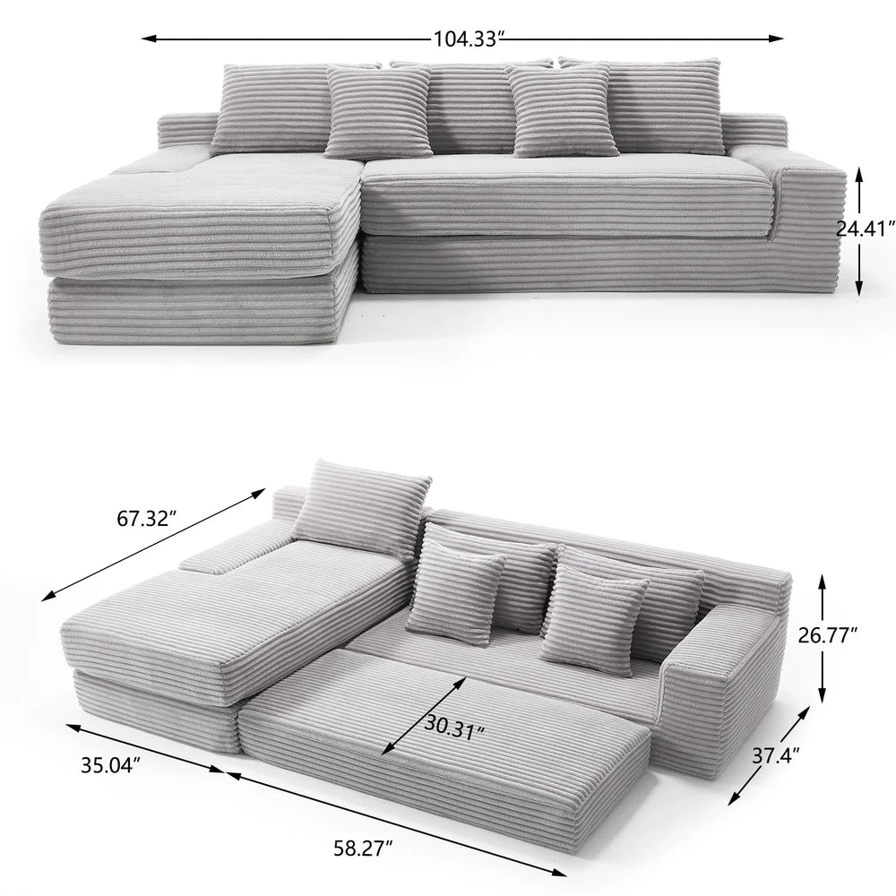 Upgrade your living space with this stylish and functional L-shaped sectional sofa, designed to provide cloud-like comfort and versatile seating. Featuring high-density memory foam cushions, it contours perfectly to your body, offering ergonomic support for hours of relaxation. The sturdy industrial steel frame ensures long-lasting stability, while the soft, durable light gray corduroy fabric adds a cozy yet modern touch to any room. Effortlessly transform this sectional into a full-size sofa bed for guests or movie nights, maximizing space without compromising style. Its compact design and modular flexibility make it ideal for apartments and small spaces. Delivered vacuum-packed, the sofa expands quickly for immediate enjoyment. Elevate your home comfort today with this perfect blend of luxury, convenience, and durability.