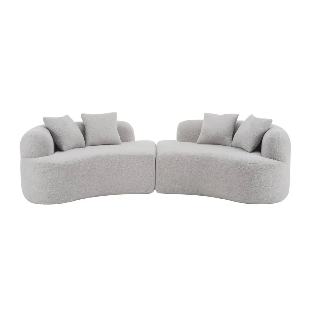 This modern curved four-seater couch features soft Teddy fabric upholstery and a foam plus spring filling for balanced comfort and support. Its compact modular design fits small spaces and apartments, ideal for primary living areas seeking stylish, cozy seating.