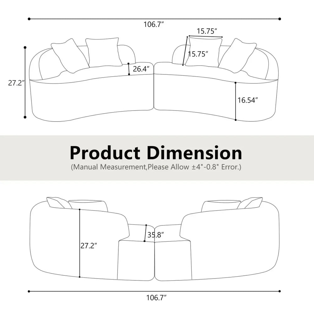 Upgrade your living space with this minimalist curved sofa, designed for both comfort and style. Upholstered in plush Teddy velvet fabric, it invites you to sink into its soft embrace while adding a modern flair to your home. Crafted with high-density foam and spring filling, the sofa offers exceptional support and resilience, maintaining its cloud-like softness over time. Its compact 106.7-inch length and modular design fit perfectly in apartments or small rooms, making it easy to arrange and move without assembly. Ideal for lounging or entertaining, this four-seat sofa combines functionality with sophisticated aesthetics to elevate your primary living space. Make your living room a welcoming retreat—relax and unwind in style today.
