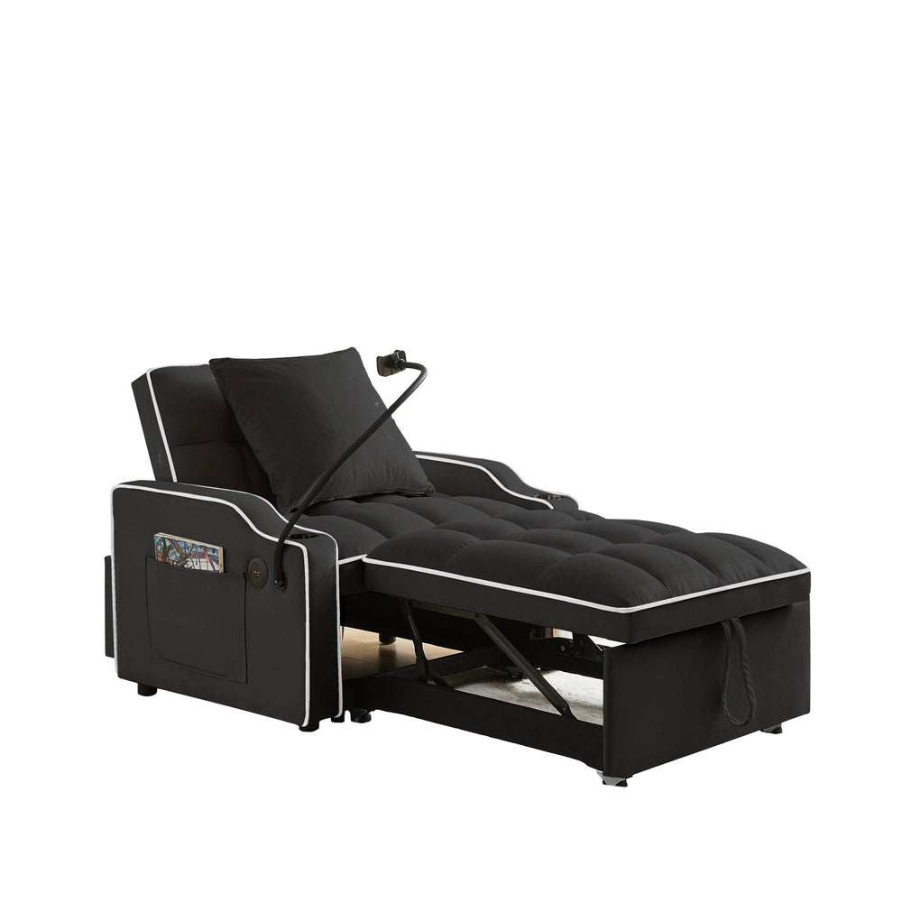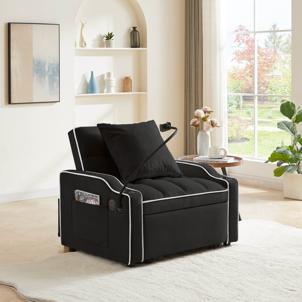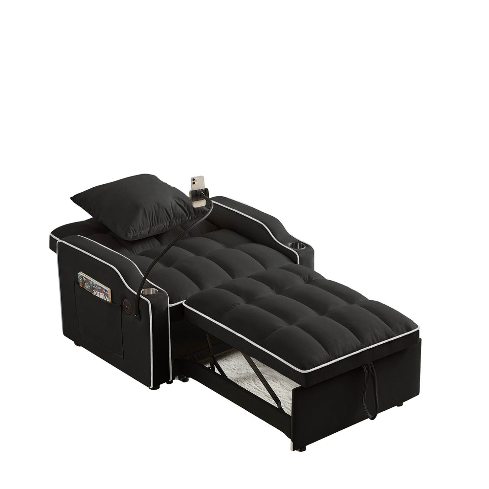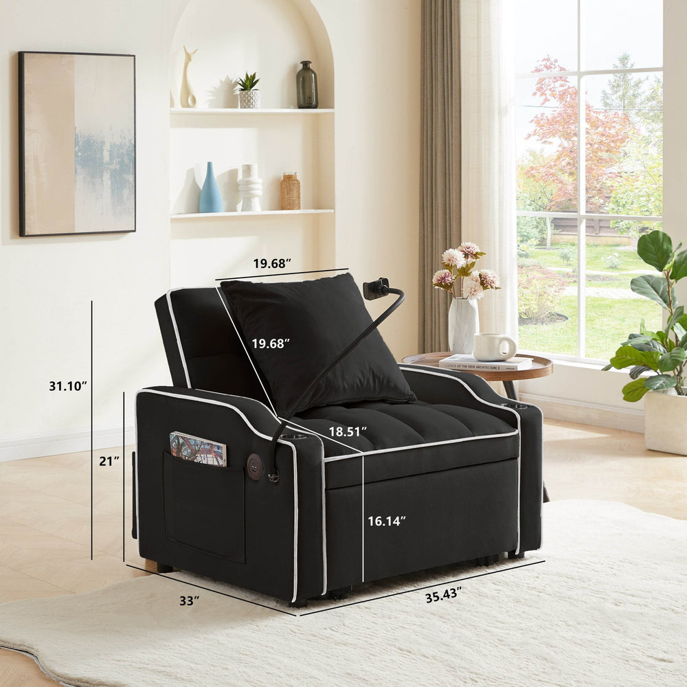 Maximize your living space without sacrificing style or comfort with this sleek convertible sofa bed. Upholstered in plush black velvet, this innovative piece effortlessly transforms from a cozy armchair to a chaise lounge and a single sleeper, adapting seamlessly to your daily needs. Its adjustable three-level backrest (110°, 140°, 180°) lets you find the perfect position for working, relaxing, or sleeping. Integrated USB and Type-C ports provide convenient, continuous charging, while the built-in cup holders keep drinks within easy reach. Compact yet functional, this sofa bed is ideal for studios, apartments, dorms, and home offices. Elevate your comfort and style today with this multi-functional velvet sleeper chair.